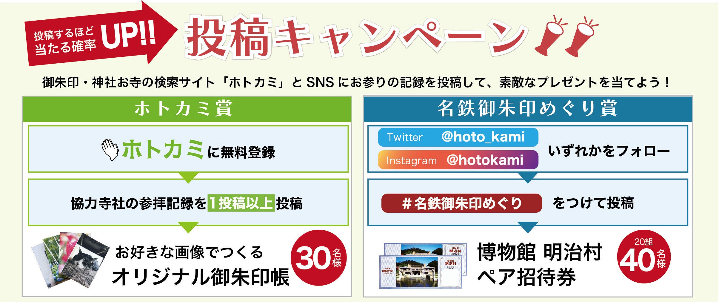 さらに、TwitterやInstagramに「#名鉄御朱印めぐり」をつけて投稿した方のなかから抽選で20組40名様に「博物館明治村ペア招待券」があたるSNSキャンペーンも開催します。