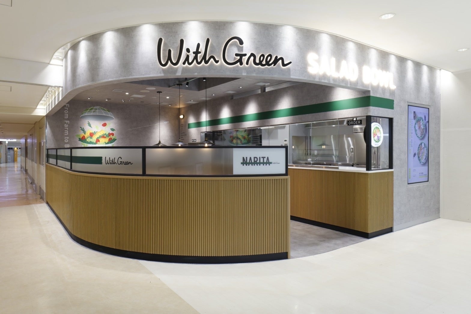 サラダボウル専門店「WithGreen」を2016年に東京・神楽坂で創業して7年半。今回の成田空港で25店舗目となり、空港エリアへの初出店です。創業時から、日本が誇るサラダを世界中の人に食べてもらいたいと考えていました。既存店舗でも多くの外国の方に来ていただいていますが、今回の成田空港第1ターミナル店は本格的に海外のお客様中心の店舗になると思うので楽しみです。ぜひ気軽に立ち寄ってみてください。