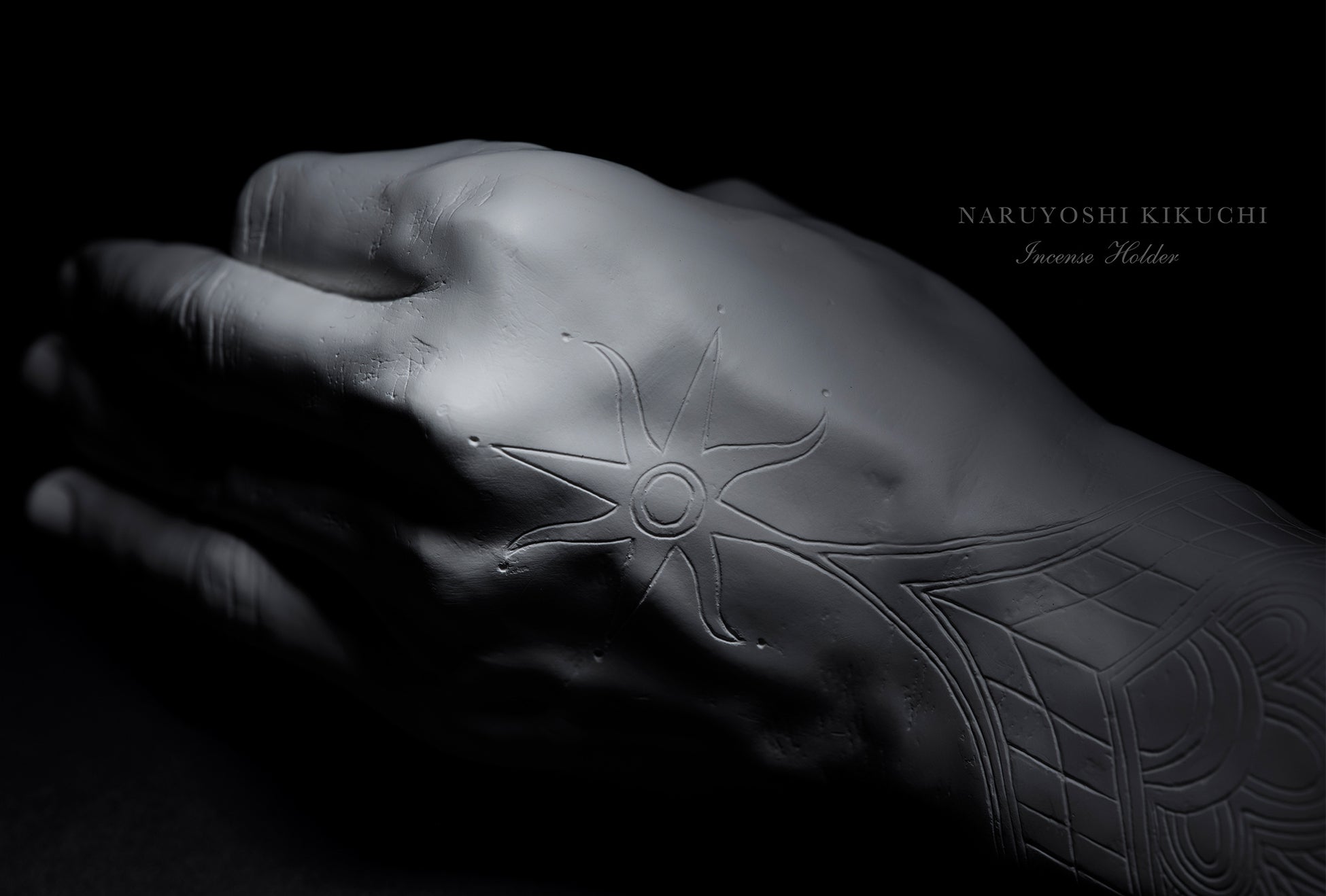 『NARUYOSHI KIKUCHI Incense Holder』は、菊地成孔氏の実際の左手から型取りした上に、菊地氏の左手のタトゥーをBALLONの職人技術により一つ一つ手で掘り上げ完全再現。お香を指先に摘まんだ、印を結んだような神々しいポージングです。