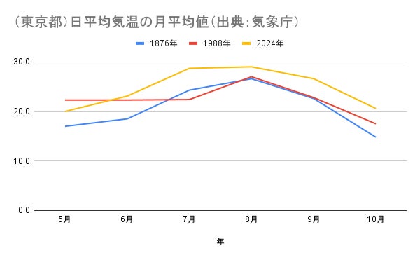 気象庁のデータによると、1876年には東京都の10月平均気温は14.8℃でしたが、2024年は20.6℃と約6℃も高くなっています。