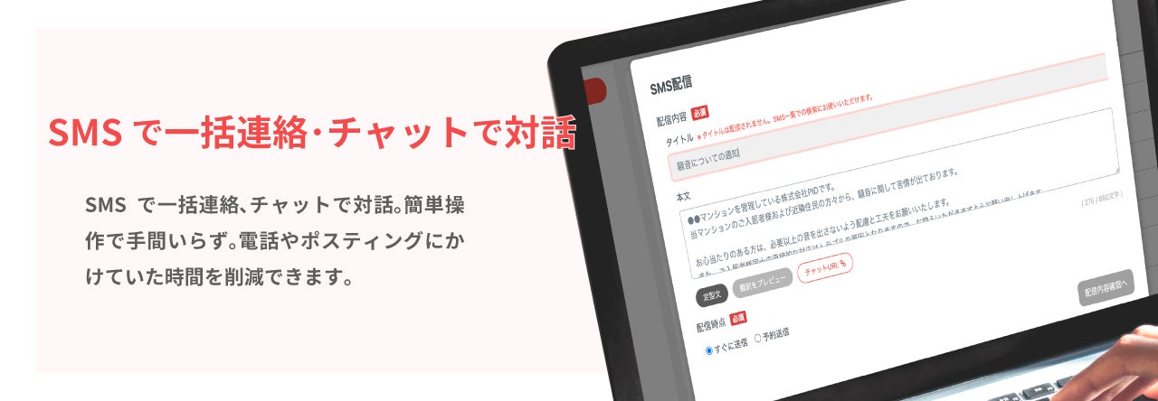 これまで、電話・ポスティング・郵送等で行ってきた業務をSMS とチャットにすることで、コミュニケーションにかかる時間を削減し業務効率の向上を実現します。また、16 言語に対応する自動翻訳機能もついているため、言葉の壁を解消し外国人入居者とのスムーズなコミュニケーションが可能になります。SMS は、主に物件の設備点検や近隣トラブルに対しての通知用に使用されています。ポスティングに代わってSMS を使用することで、一斉送信で通知することができ二次クレームを防止します。