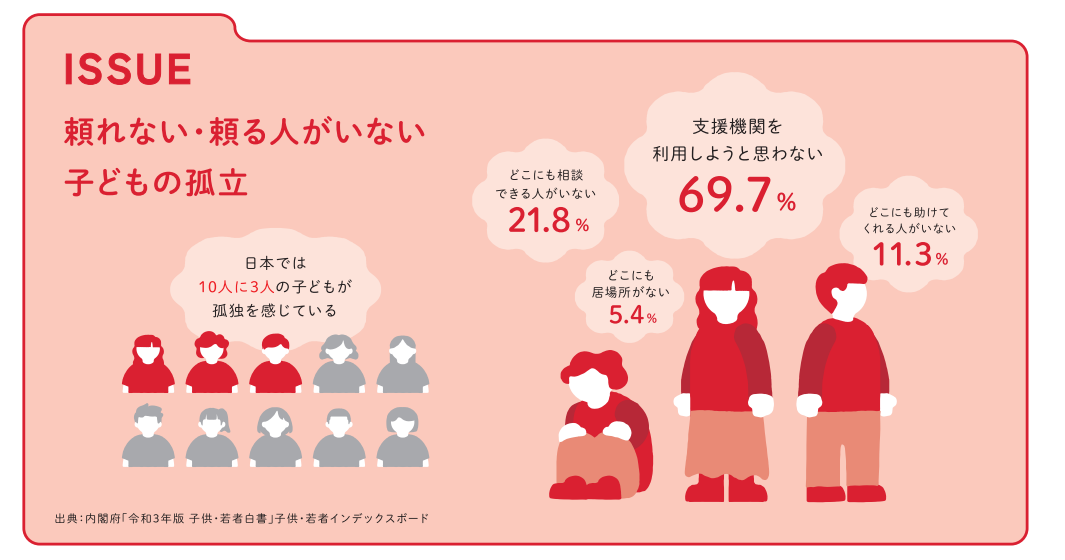 地域社会を取り巻く現状として、子どもの虐待や貧困、いじめなどの問題が顕在化しています。そこには安全に頼れる誰かがいない環境で、他者や社会への信頼を失い、孤立した環境の中、痛みや心の傷を一人で抱えて頑張っている子どもたちの姿があります。