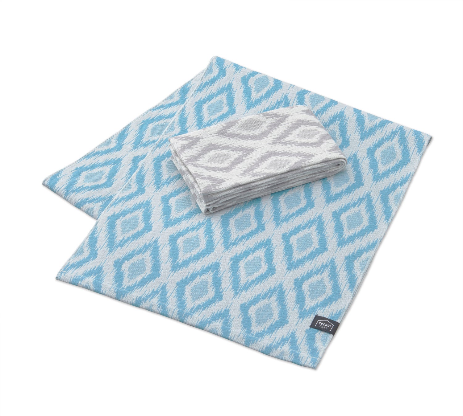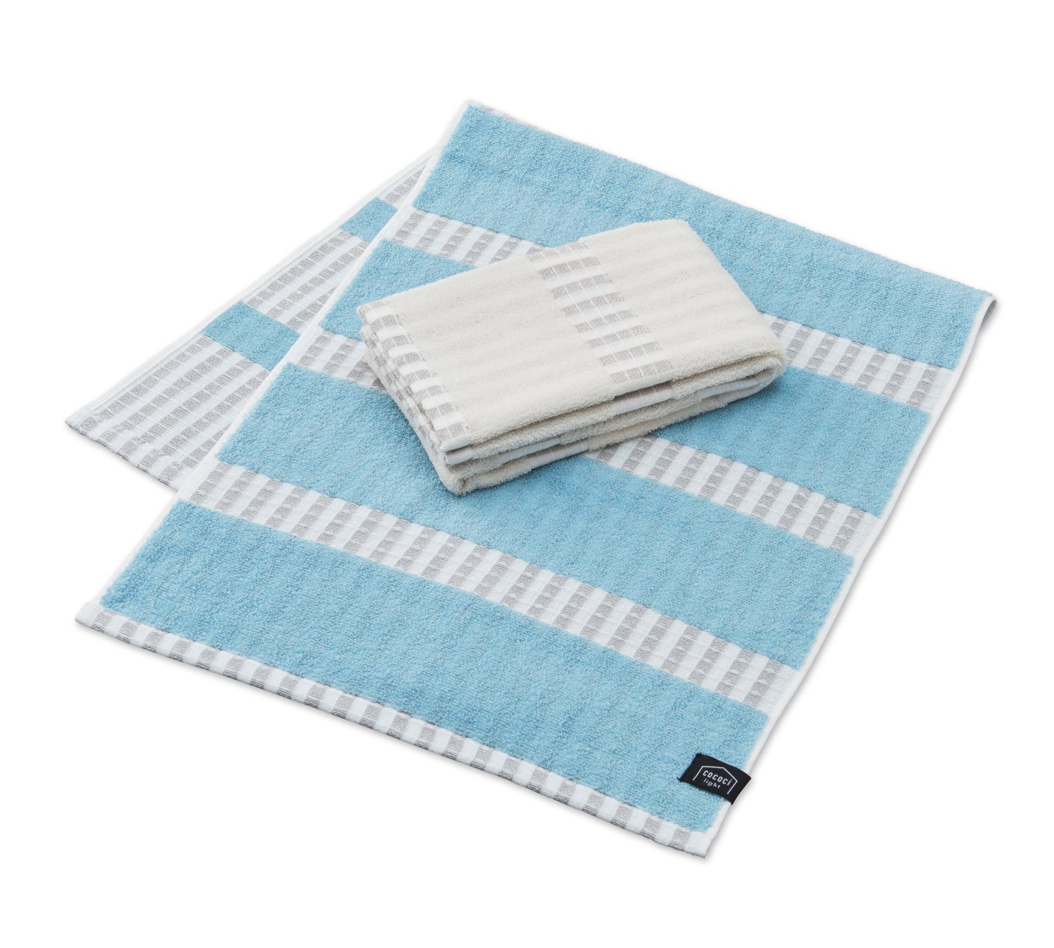 表面はパイル面が多め、裏面はワッフル織でガーゼ仕様が多めとなった1枚で2つの質感が楽しめるよくばりなタオルです。リバーシブルでお使いいただけます。ストライプとボーダーの組み合わせが爽やかなデザインです。