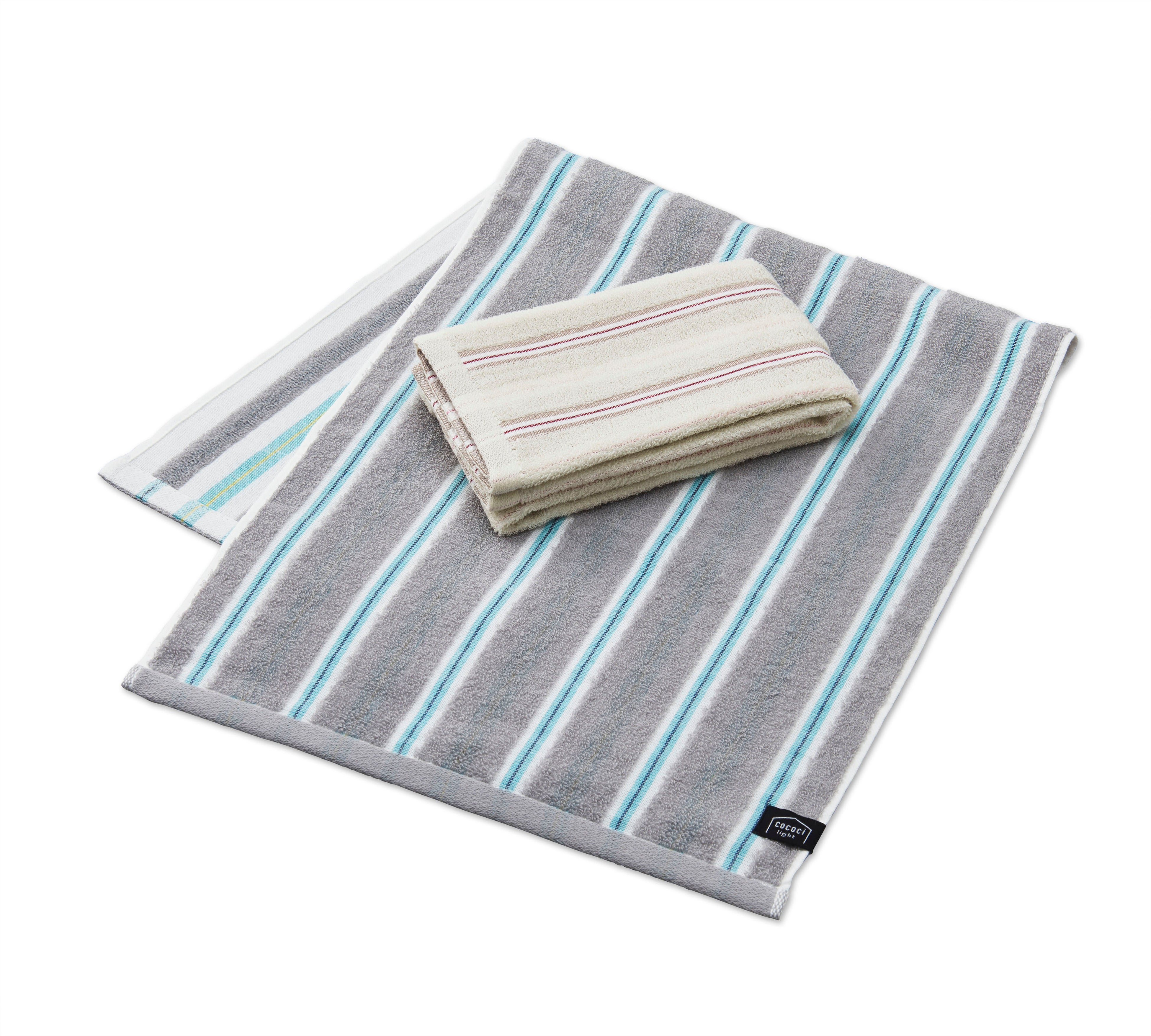 適度なボリュームと吸水力のあるパイルとさらりとした優しい肌触りのガーゼを組み合わせた薄手のタオル。表面はパイル部分が多め、裏面はガーゼ部分が多めなので1枚で2つの質感を楽しめ、リバーシブルでお使いいただけます。爽やかでクールなストライプのデザインです。