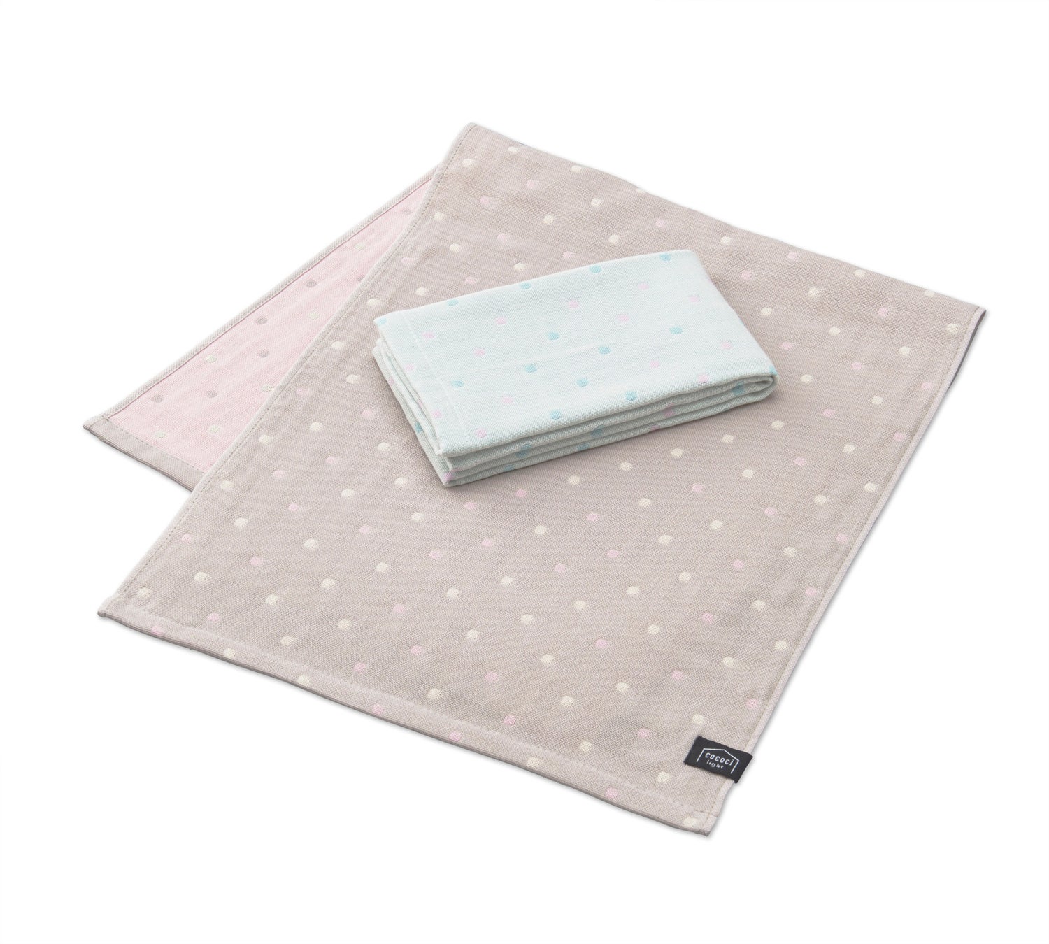 ガーゼを3枚重ねた、さらりとした風合いと薄くて軽く乾きが早い3重ガーゼタオル。絞りやすく乾きやすいので、お風呂やアウトドアにも大活躍。シンプルで愛らしいドットデザイン。