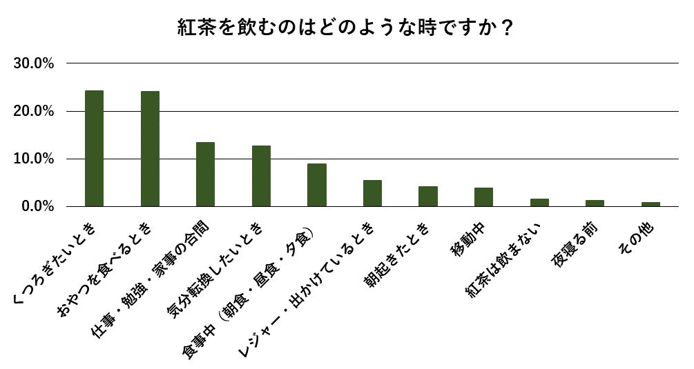 おやつを食べる時、くつろぎたい時がそれぞれ24%であわせて48%と全体の半数近くとなりました。複数回答の比率としては、女性の平均2.4と比較し、男性は1.8だったことから、男性より女性の方がより多くの機会に紅茶を選んでいることが分かりました。