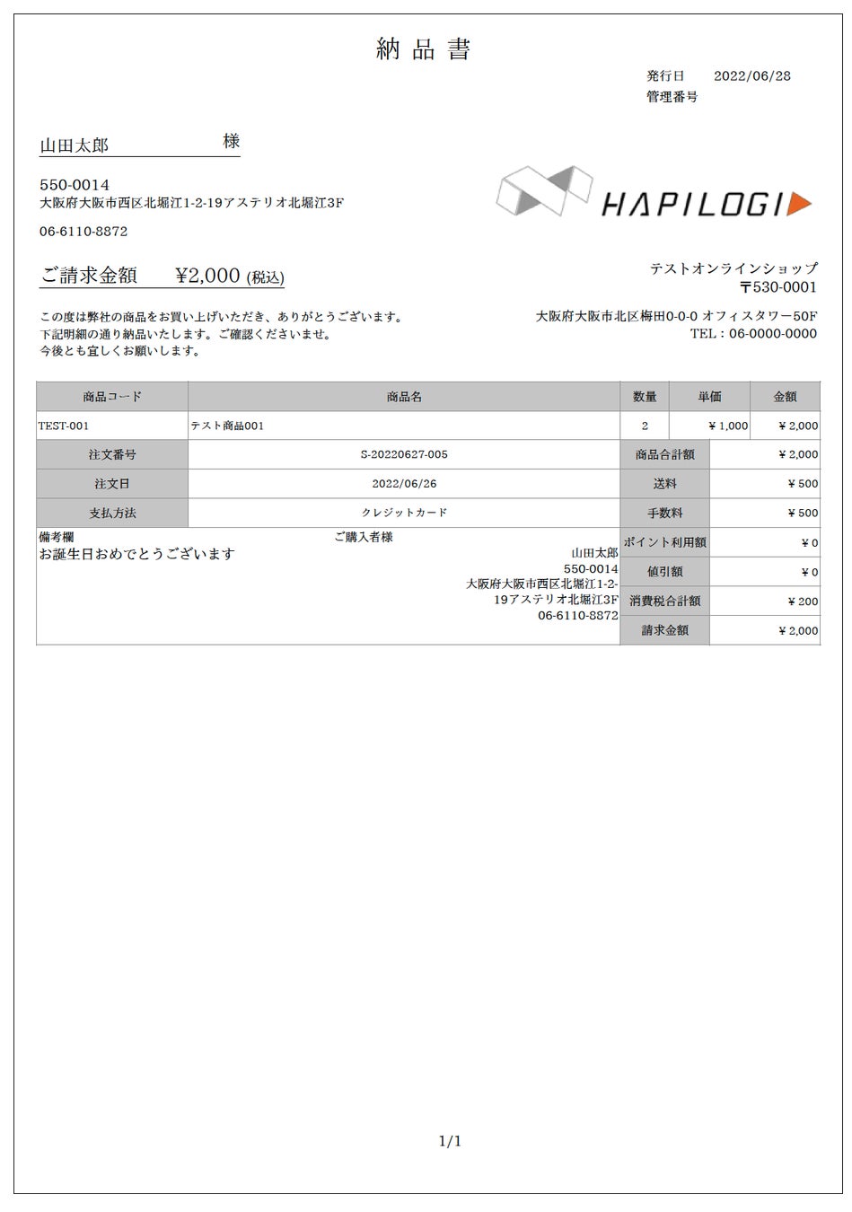 商品に同梱する納品書です。自社情報(住所、TEL、サイトURLなど)、ロゴ、任意のあいさつ文などの出力をカスタマイズできます。また、個人情報を出力するかどうかの設定も可能です。