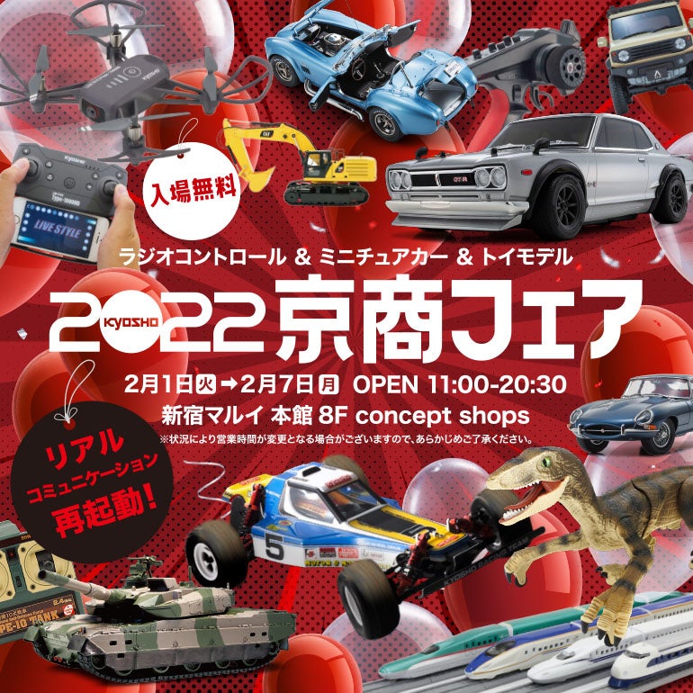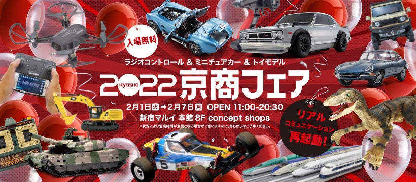 本格RC(Radio Control:ラジオコントロール)モデルやミニカー等、ホビー製品の製造・販売を行う京商株式会社(本社:神奈川県厚木市 代表取締役社長:渡邉克美)は、2月1日(火)〜 2月7日(月)の期間にて「 2022 京商フェア」を新宿マルイ 本館8F concept shopsにて開催致します。皆様のご来場を心よりお待ちしております。