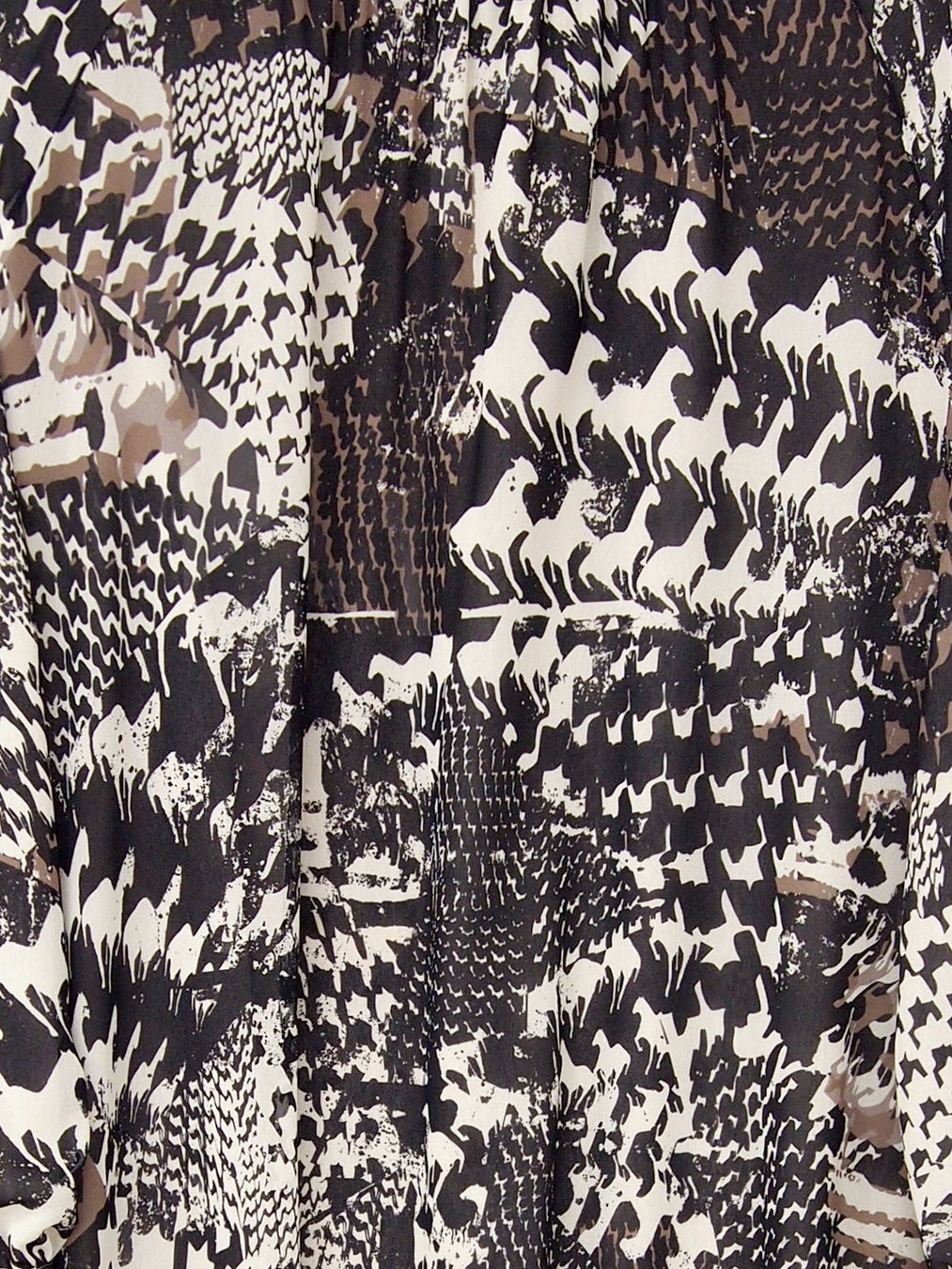 乗馬が趣味であったオジャール氏は馬をモチーフとした数々の作品を残してきました。そんな馬を愛するオジャール氏にちなんだハウンドトゥースとホースをジオメトリックにアレンジしたオリジナルプリントのドレスを提案します。ソフトな風合いのジョーゼット素材で、首元のシャーリングやギャザー、ラグランスリーブなど品の良い柔らかな女性らしさを表現しました。
