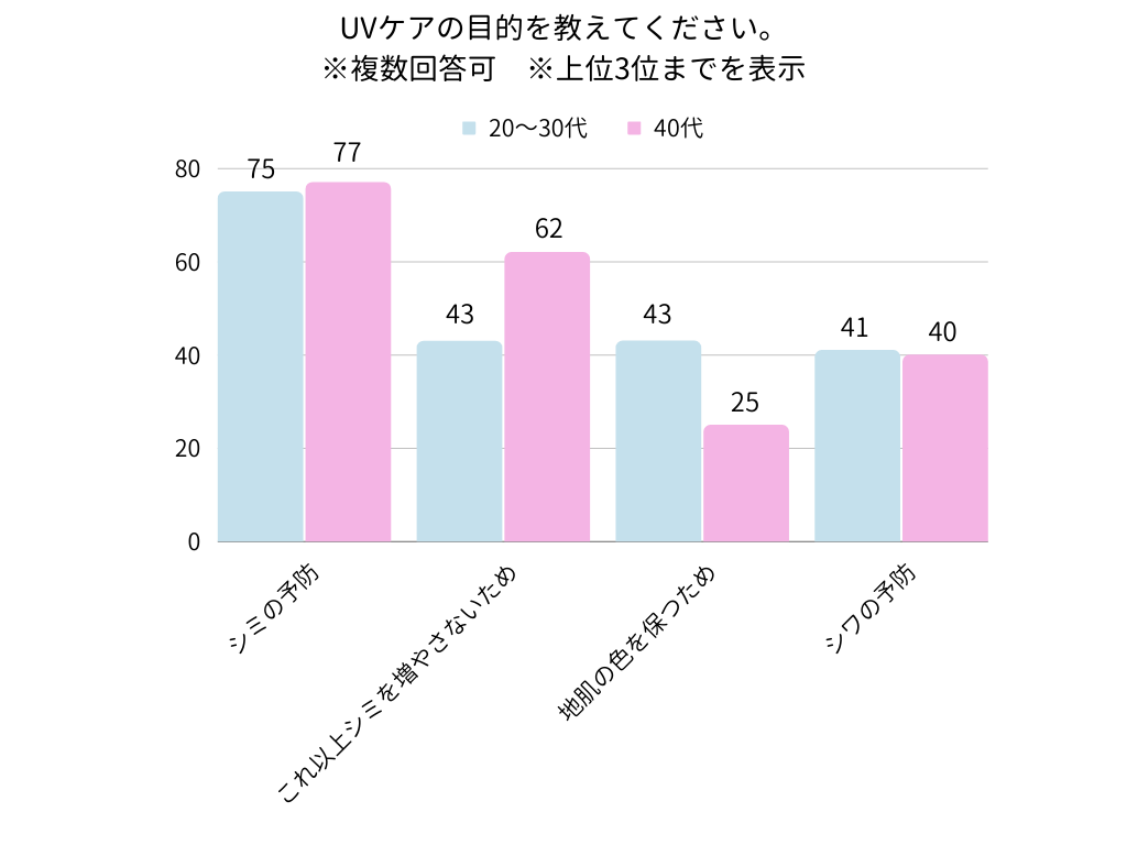 このことから全世代、“シミを予防し現状よりもシミを増やさないこと”が、UVケアの目的で重視していることだと分かりました。