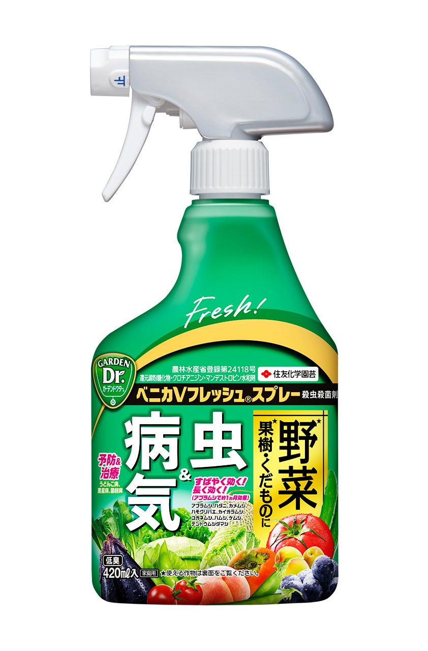 「ベニカVフレッシュスプレー」は3つの有効成分で確かな効きめを実現する、ハイスペックな殺虫・殺菌スプレーです。野菜、果樹、花、庭木など幅広い植物に使用でき、害虫にはすばやく長く効く、速効性と持続性を兼ね備えています。また病気に対する予防効果と治療効果もあり、殺虫・殺菌成分は植物内に浸透移行するため、雨が降っても効果が続きます。人気の家庭菜園にチャレンジしたい方、病害虫にお困りの方へ頼れる一本としておすすめのスプレーです。