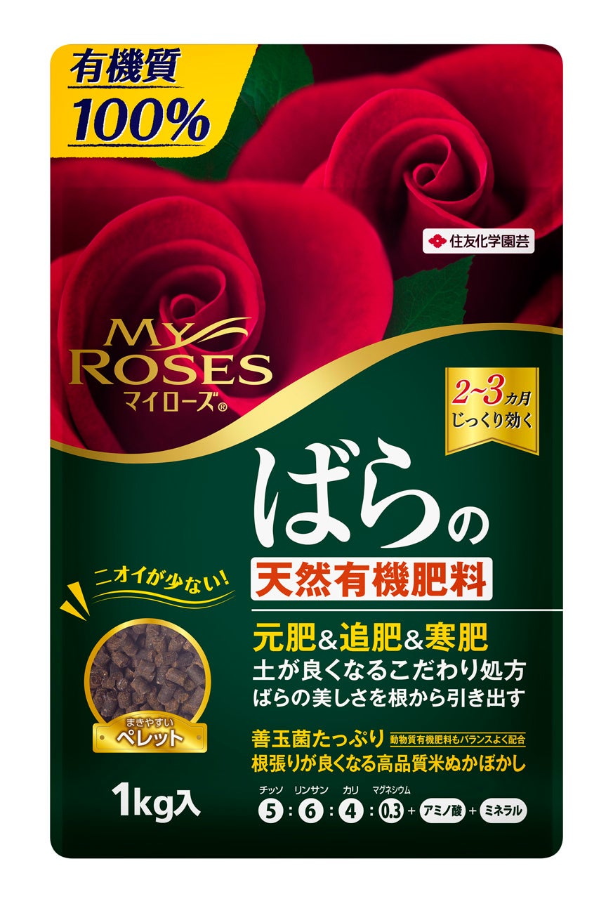 「マイローズばらの天然有機肥料」は、人気の「マイローズ」シリーズから新しく登場した、ばらを丈夫に育て美しさを根から引き出す、100%有機質の肥料です。緩効性と速効性に優れ、寒肥や元肥、追肥として2~3ヵ月効きめが持続します。また、チッソ・リンサン・カリ+アミノ酸・ミネラル・善玉菌を豊富に含んだ高品質の米ぬかぼかしの作用により、使い続けることで土壌中の有用微生物群が多様化・活性化するため、健康的な根が張りやすくなり、丈夫なばらを育てることができます。5月頃から出回りだす新苗の元肥や地植え、鉢植えのお礼肥として活用でき、健やかで美しいばら栽培管理のお手伝いをします。