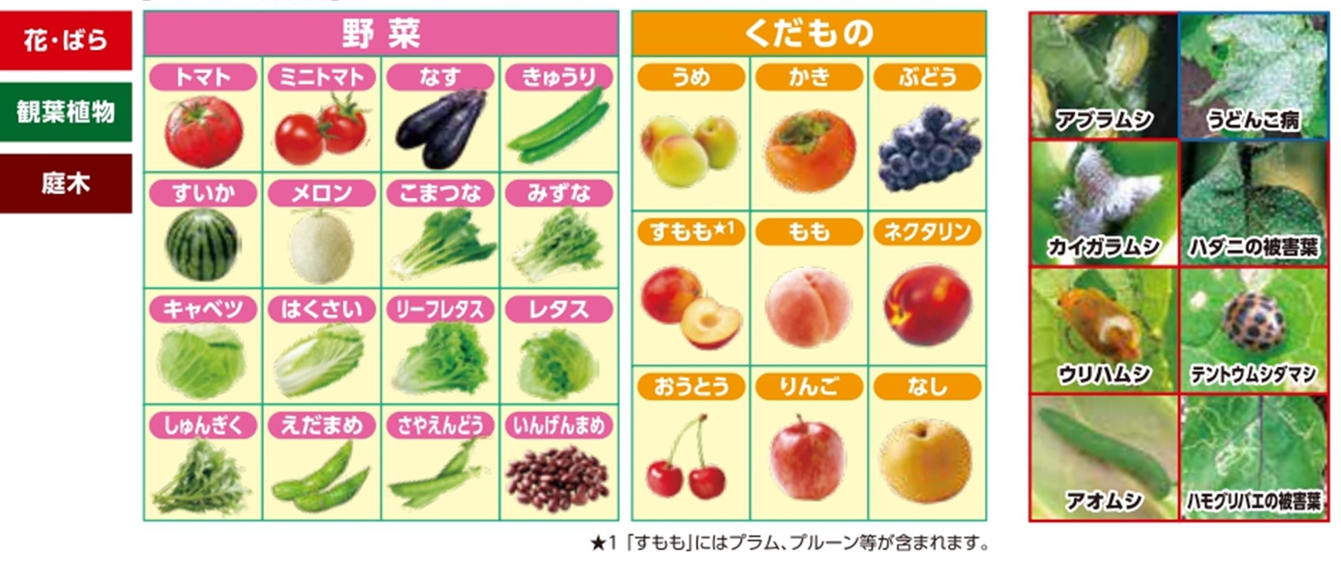 特長: 野菜、果樹、くだもの、花、庭木など幅広い植物に使える殺虫・殺菌スプレー