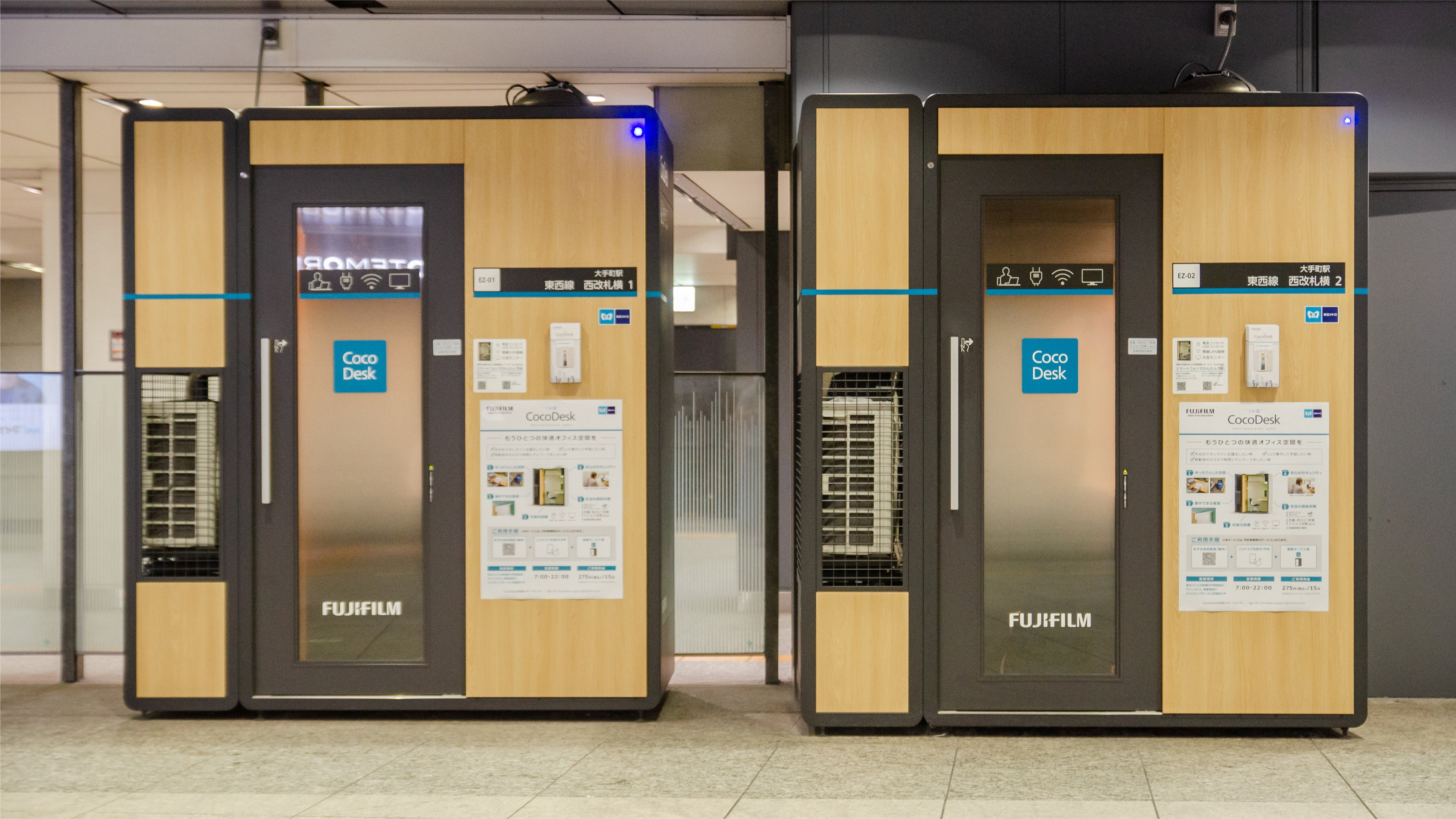 CocoDeskとは、富士フイルムビジネスイノベーションが提供している個室型ワークスペースで、ビジネスパーソンは外出先や移動中のスキマ時間を活用し、密閉・密集・密接を避けながら安全・快適にデスクワークやWeb会議などのテレワーク・リモートワークを行うことができます。現在、東京メトロの駅構内を中心に100台が設置されており、今後は全国各地の駅ナカ・ビルナカ・街ナカにも展開予定です。