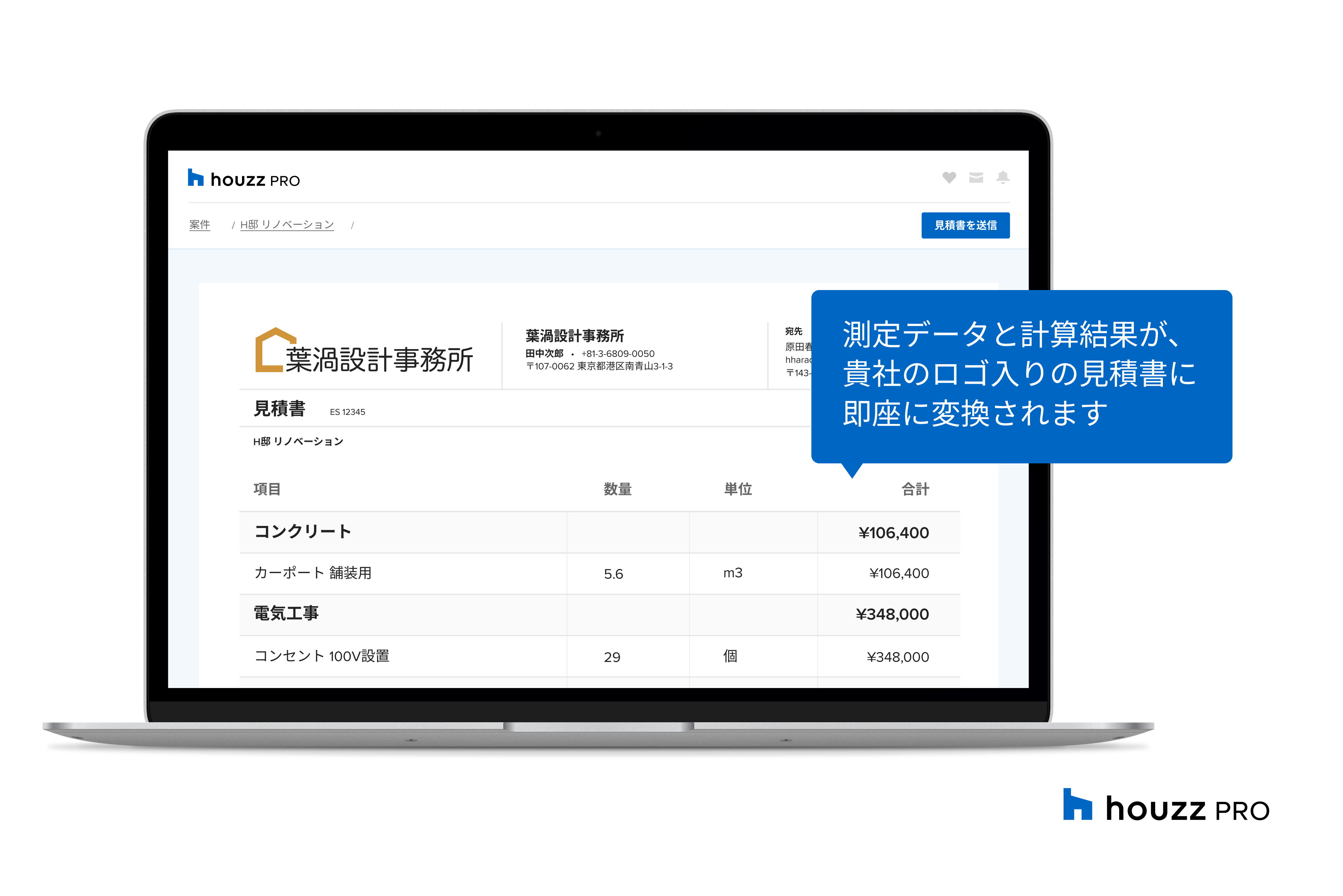 Houzz Pro を通じて、住まいづくりとインテリアデザインの専門家は、効率的で収益性の高い事業を運営し、新規顧客を獲得することを容易にし、卓越した顧客体験を提供することができます。Houzz Pro は、北米、ヨーロッパ、アジア、オーストラリアの10か国以上でご利用いただけます。お申し込みいただくプランは予算やチーム編成に合わせてお選びいただくことができ、それぞれにウェブサイト作成サービス、見込み案件管理ツール(CRM)、事業管理ツールなどが含まれます。https://www.houzz.jp/pro で無料の Houzz Pro アカウントを作成し、積算ツールをお試しください。また、iOS ( https://apps.apple.com/jp/app/houzz-pro/id1488002482 ) や Android ( https://play.google.com/store/apps/details?id=com.houzz.pro&hl=ja ) より、Houzz Pro アプリもご活用ください。