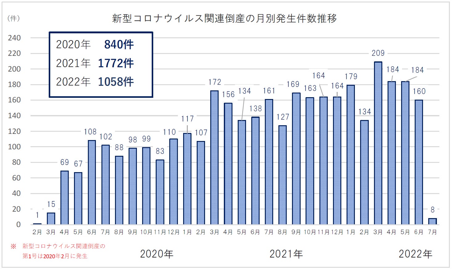 帝国データバンクの「新型コロナウイルス関連倒産」動向調査※(1)によると、2020年に発生した新型コロナウイルスの影響から発生した関連倒産件数は、全国で3,670件(2020年2月~2022年6月末)とされており、2022年では既に1,058件が確認されています。産業別で見ても、最大の倒産数である飲食業の562件、不動産業界でも77件が倒産しています。直近では、感染の第7波に入ったとの政府による見解もあり、今後も新型コロナウイルス関連の企業倒産の増加が想定されます。