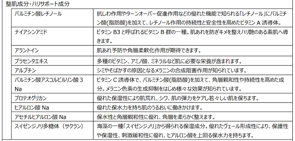 *2:パルミチン酸レチノール(整肌成分) *3:整肌成分 *4:加水分解カイメン *5:ヒト脂肪細胞順化培養液エキス