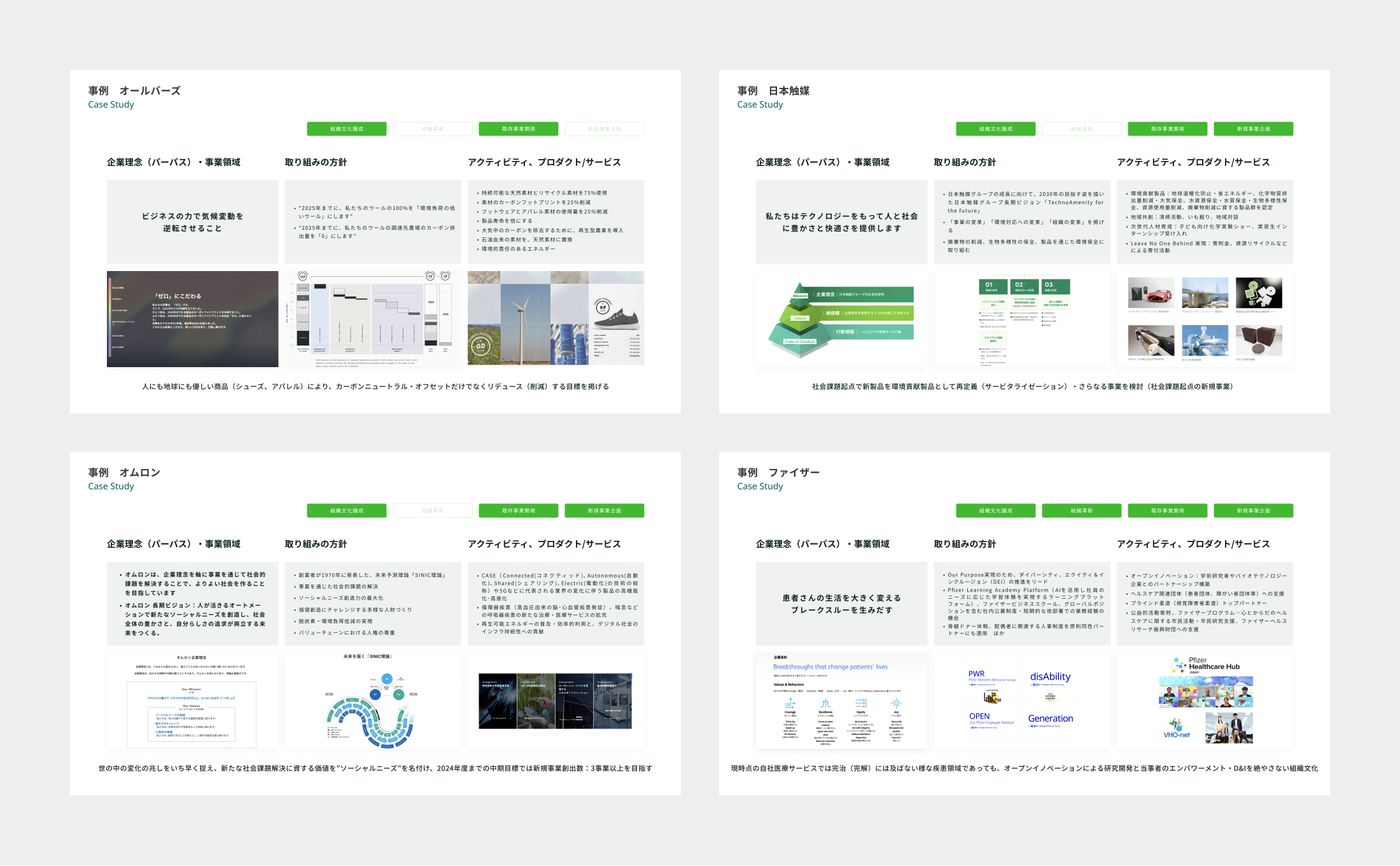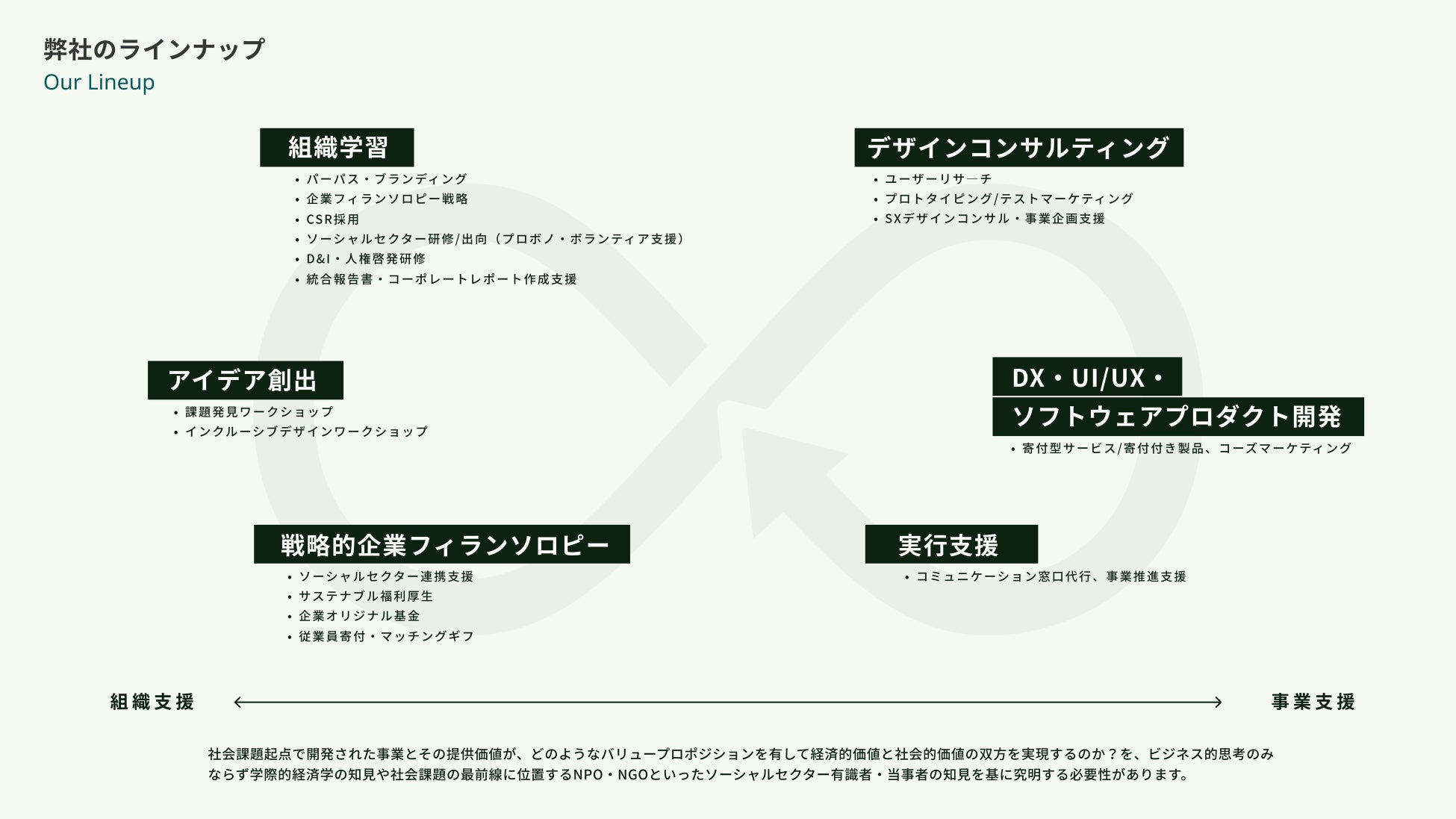 誰ひとり取り残さないサステナブルな世の中を目指すパートナーとして、企業のビジョン・ミッション・パーパス策定から組織学習・戦略的な企業フィランソロピー設計、そして新規既存を問わない事業開発を通じて企業のSX(サステナビリティ・トランスフォーメーション)推進をサポートします。