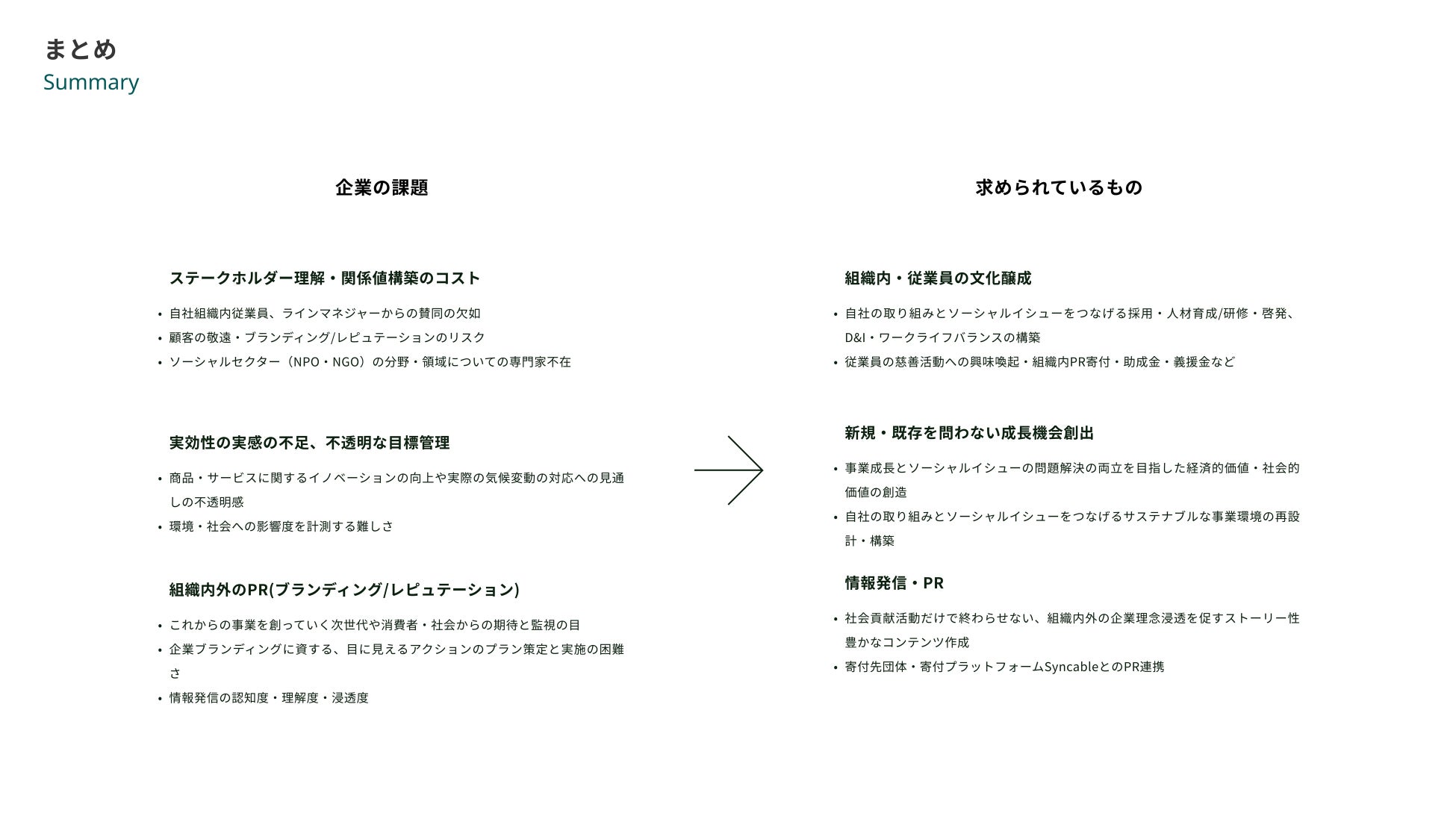 寄付プラットフォームSyncableによってネットワークされた3,000を超える全国のソーシャルセクター(NPO・NGO)、パブリックセクター(公共法人、地方自治体、独立行政法人)との繋がりを活かして、多様な社会課題の当事者やソーシャルセクターの各種ステークホルダーと共に事業を創る”共創型事業デザイン”で価値を提供します。