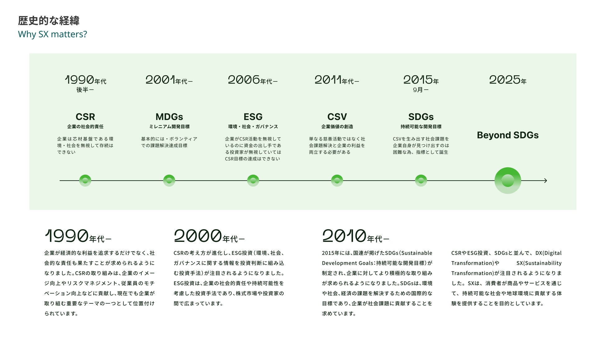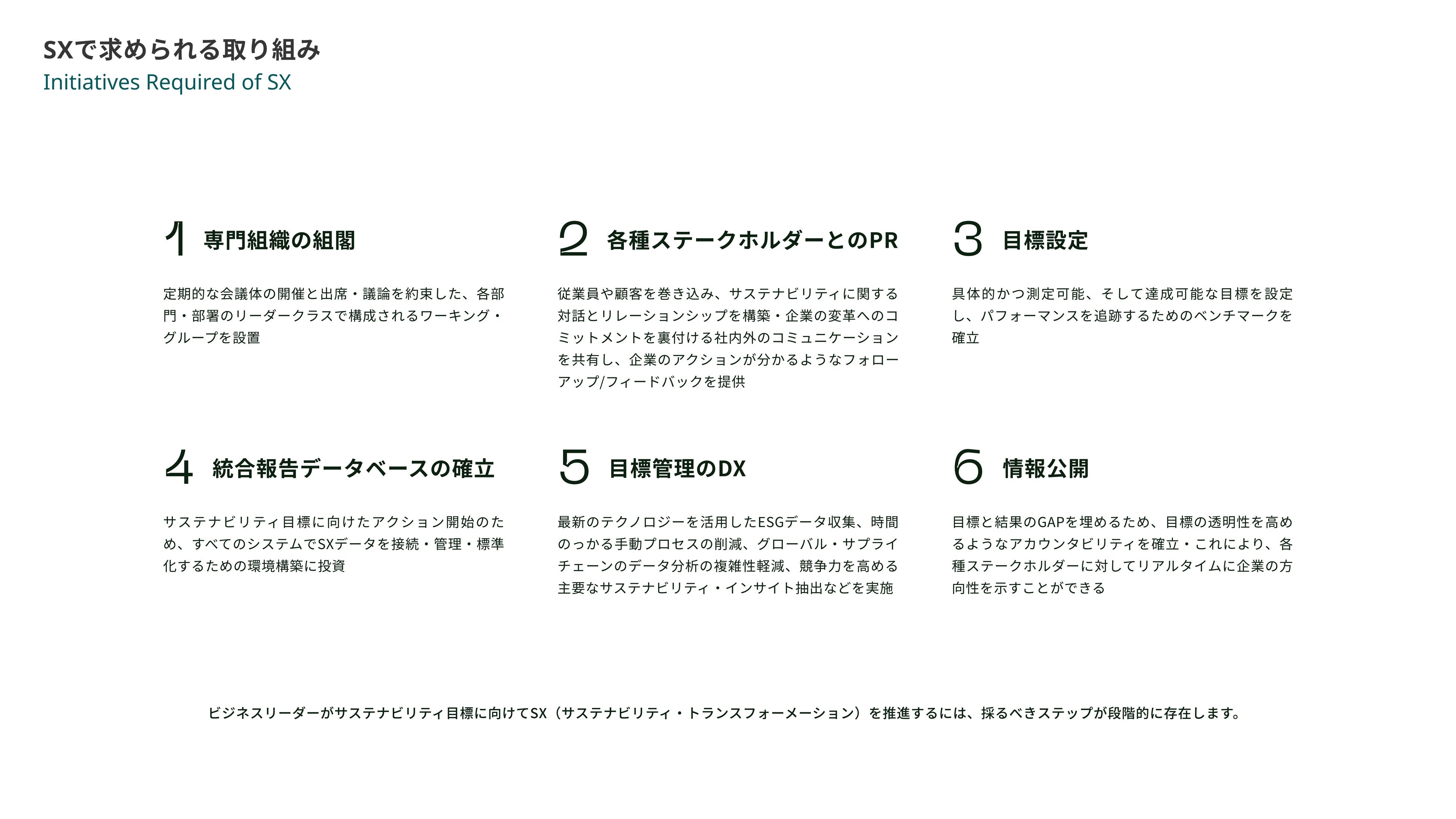 SXは企業や社会のみならず、政府や市民社、NPO・NGOなど多様なステークホルダーの参加が必要とされています。これは単なる一時的な取り組みではなく、持続可能な未来のための社会的変革を目指す継続的な仕組みなのです。