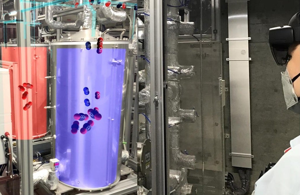 (「CO₂循環プラント」内での本ARシステム利用時の様子。ARデバイス「HoloLens 2」を装着し、現実空間上に二酸化炭素等を表す3Dエフェクトを重ねて投影している)