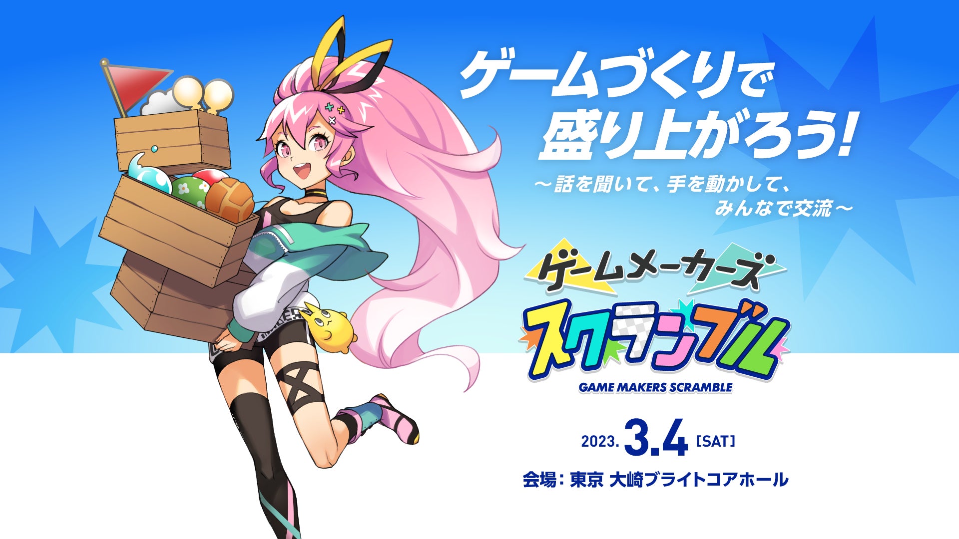 2023年3月4日(土)に東京・大崎にて「ゲームメーカーズ スクランブル」を開催いたします。ゲームづくり初心者でも楽しめる講演や、その場でゲームづくりに関わるツールを触って覚える体験イベント、参加者同士で交流可能な懇親会など、その他さまざまな企画を用意しております。