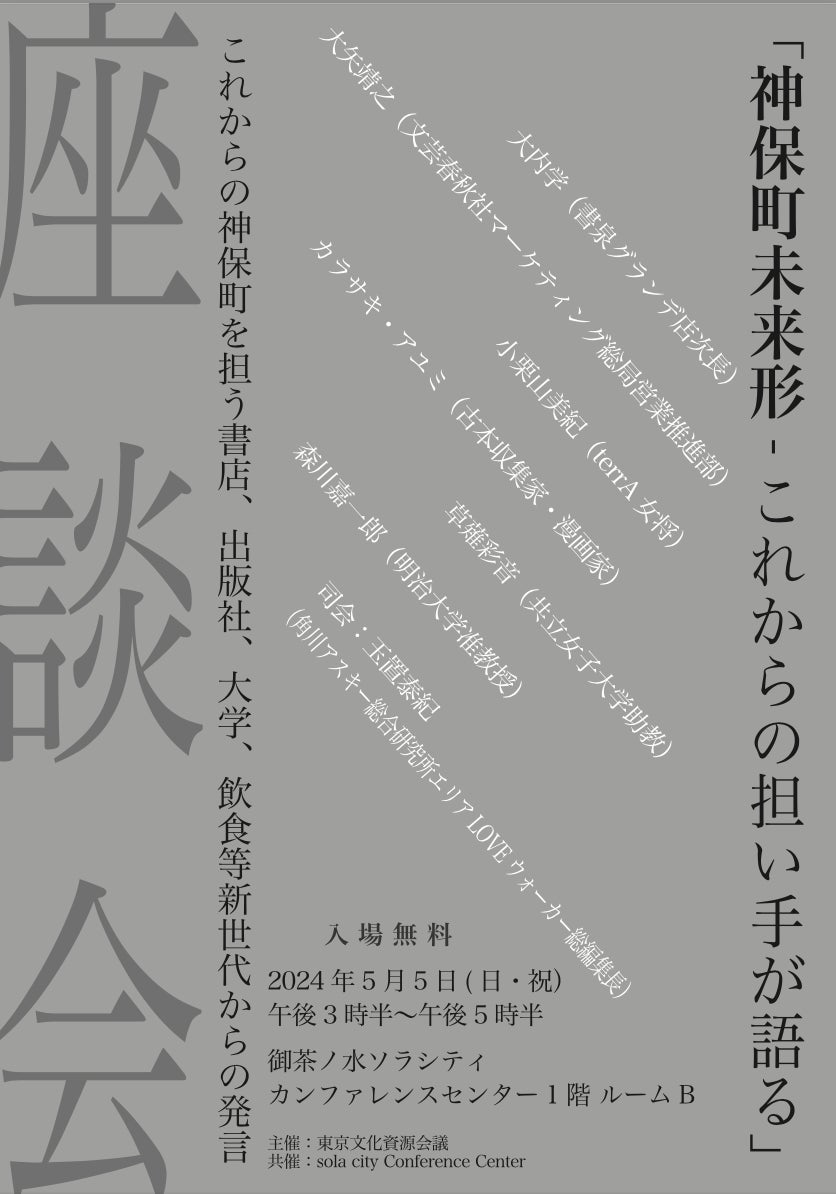 東京文化資源会議では、座談会「神保町未来形 ーこれからの担い手が語る」を、ひじりばし博覧会2024の企画の一つとして、2024年5月5日(日)午後3時半から、御茶ノ水ソラシティ カンファランスセンター1階 Room Bで開催いたします。