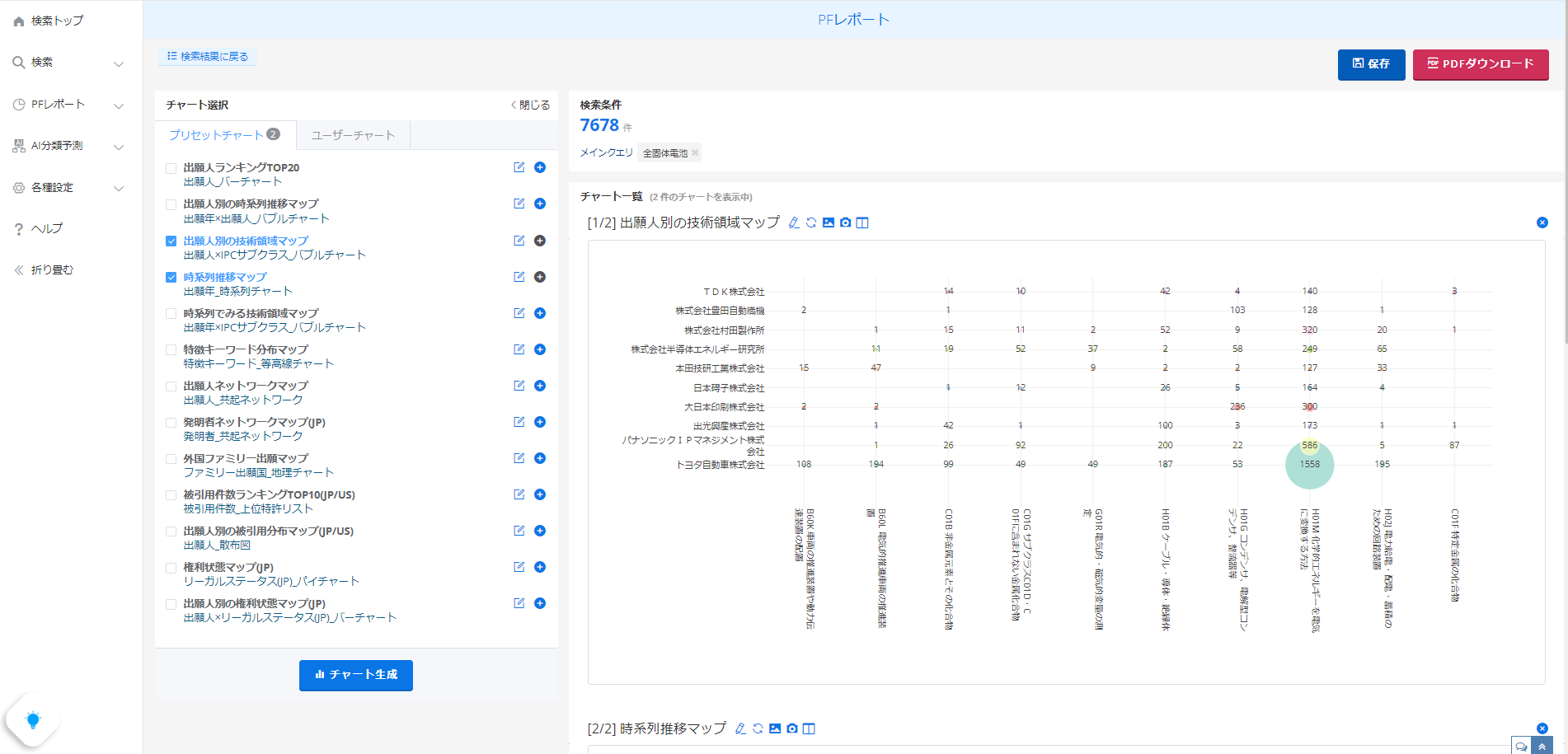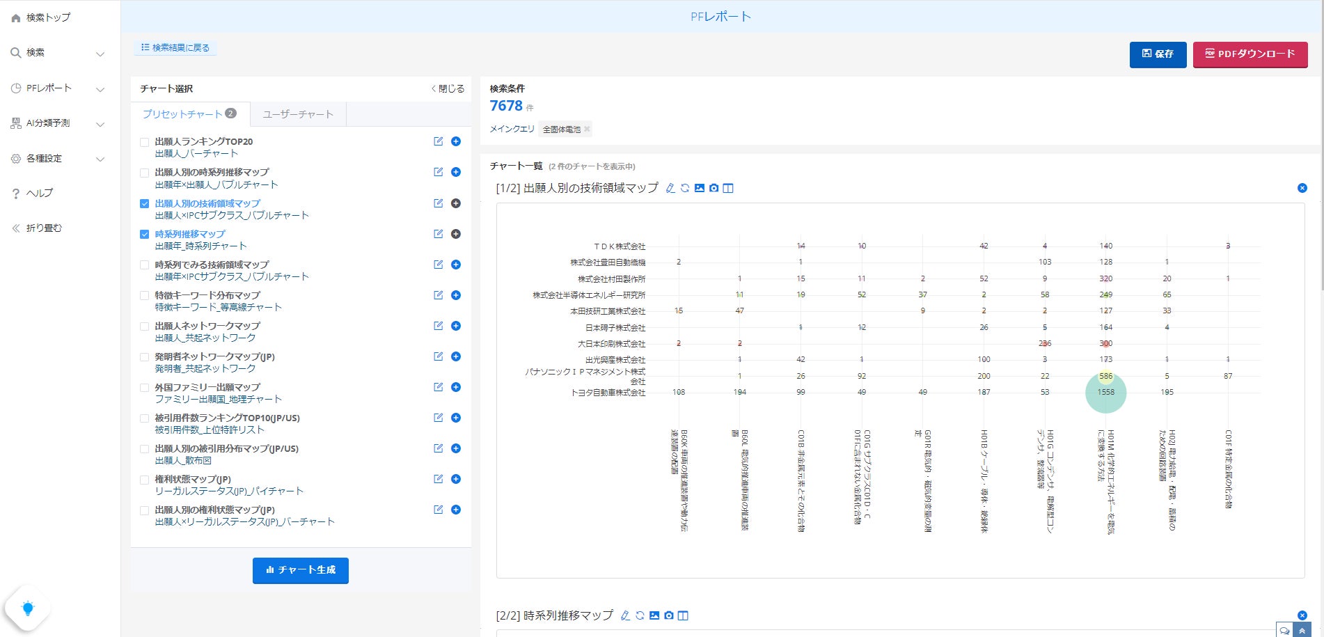 PFレポートは、複数グラフを同時表示することで、より効率的に多角的な特許分析が可能となります。