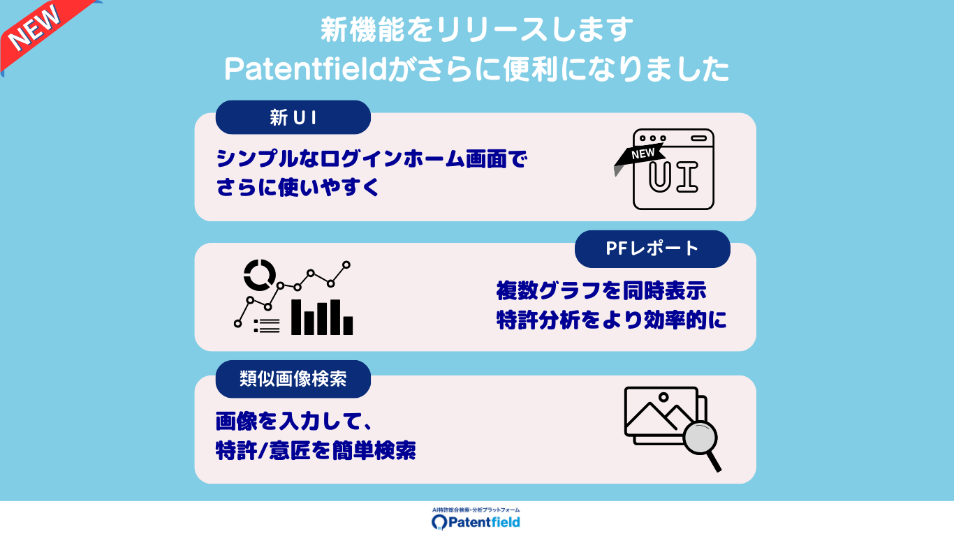 『AI特許総合検索・分析プラットフォーム Patentfield』について、新たに3つの新機能「新UI」「PFレポート」「類似画像検索」をリリースいたします。