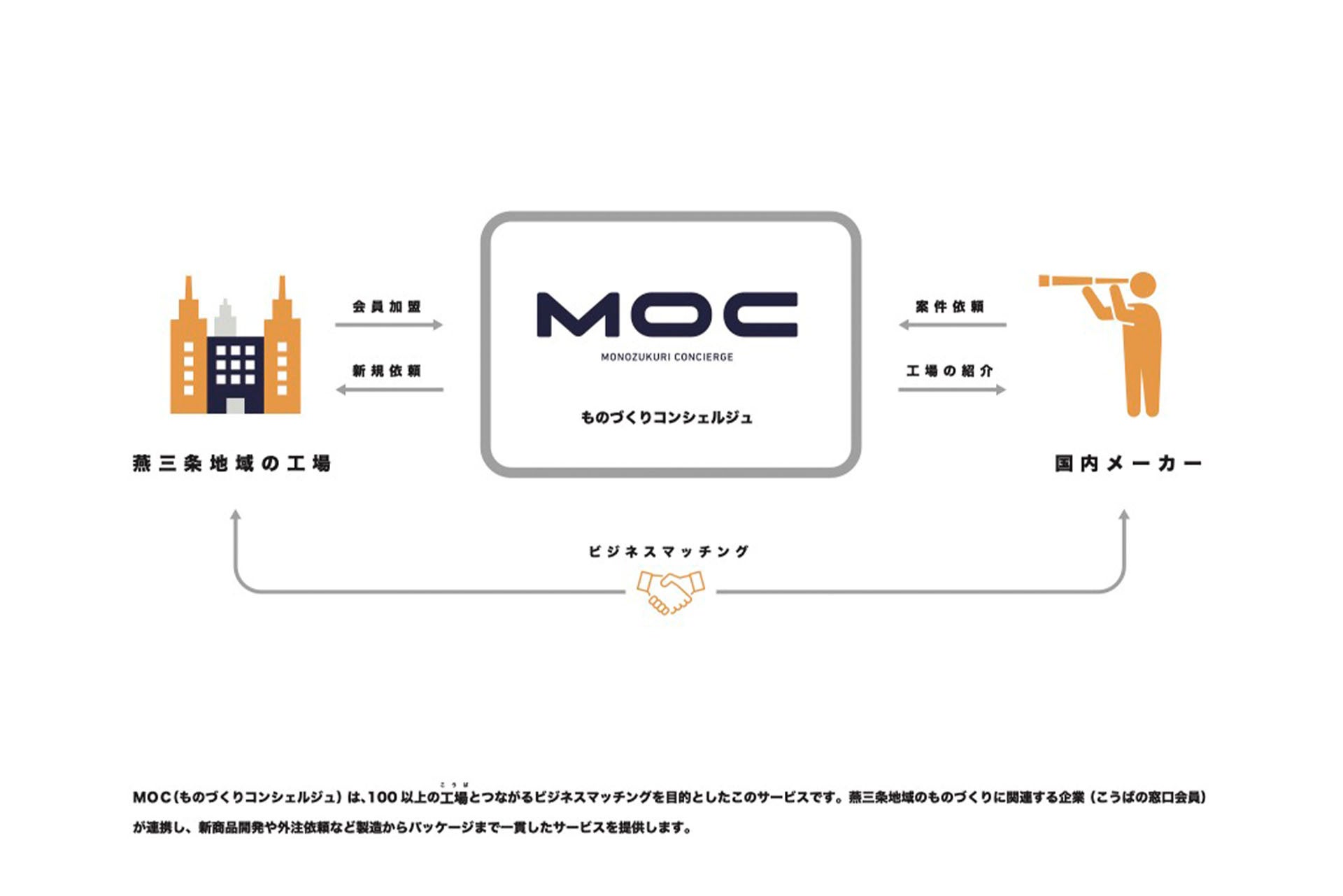 MOC(ものづくりコンシェルジュ)は、100以上の工場(こうば)とつながるビジネスマッチングを目的としたサービス。燕三条地域のものづくりに関連する企業(こうばの窓口会員)が連携し、新商品開発や外注依頼など、製造からパッケージまで一貫したサービスを提供します。