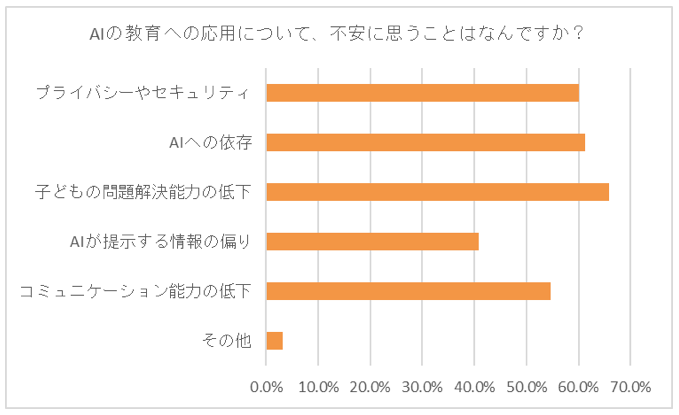 AIの発展により、人々の生活が便利になることが期待される中、教育への応用については「問題解決能力の低下(65.8%)」「AIへの依存(61.3%)」「プライバシーやセキュリティ(60.1%)」に対して不安を感じる保護者が多いことが分かりました。