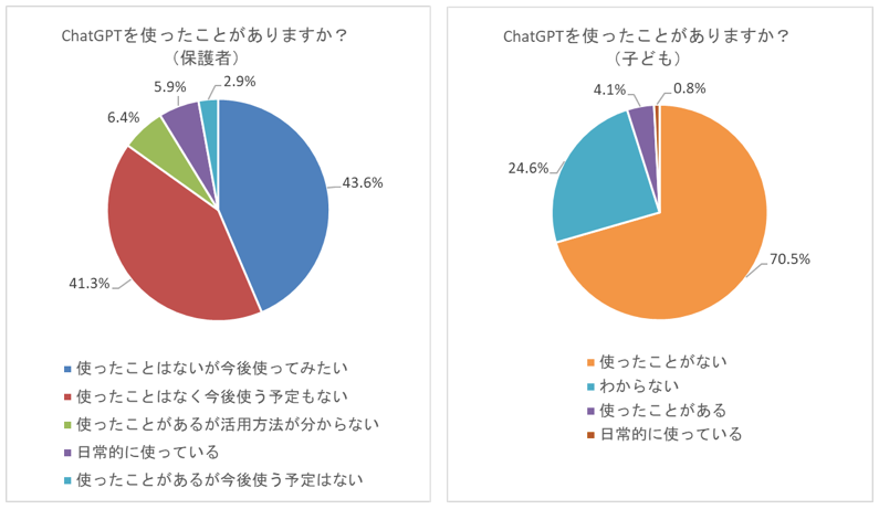 「使ったことがある」と回答された保護者は15%程度。利用したことがない保護者の今後の利用については「今後使ってみたい(43.6%)」「今後使う予定もない(41.3%)」と回答が割れる結果になりました。一方、子どもでChatGPTを利用したことがあるとの回答は4%に留まり、7割以上の子どもは利用したことがないという実情がわかりました。