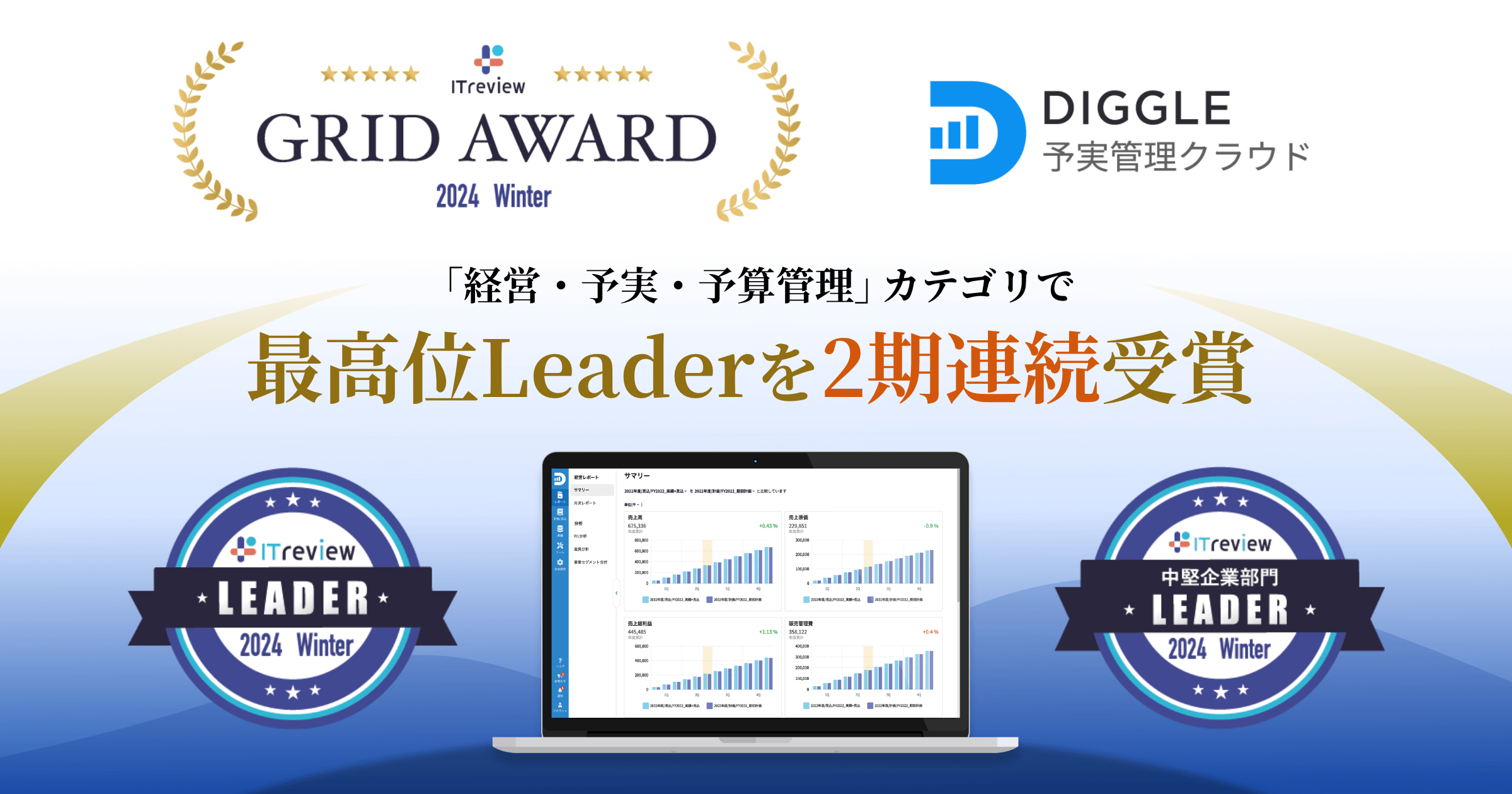 経営管理プラットフォーム「DIGGLE」が、ITreview Grid Award 2024 Winterにて、「経営・予実・予算管理」カテゴリで最高位の「Leader」を2期連続受賞