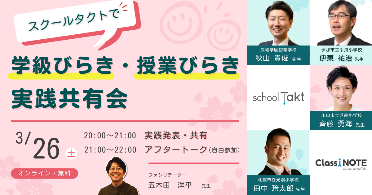 株式会社コードタクト(本社:東京都渋谷区、代表取締役:後藤 正樹、以下「当社」)の授業支援クラウド「スクールタクト」は、新年度に向け、ICTを活用し先生と児童生徒の距離を縮める「学級びらき・授業びらき」の実践共有会を3月26日(土)にオンラインで開催します。