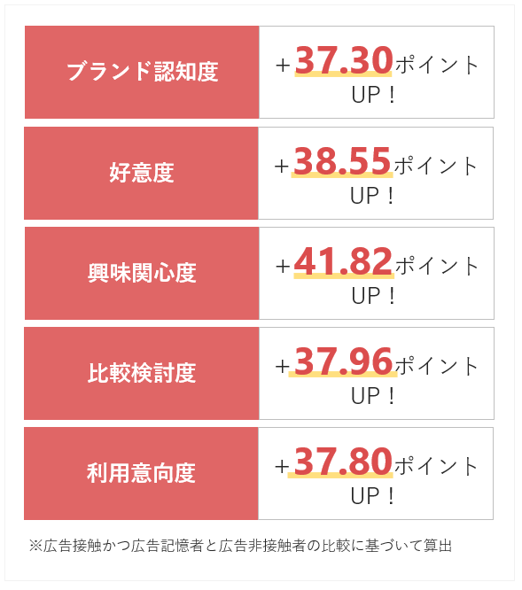 分析の結果、「ビデオリリース」は、視聴者の記憶に残ることで 、ブランド認知度から、好意度、興味度、比較検討度、利用意向度までの指標が平均的に37~41ポイント程度上昇することが明らかになりました。これらの平均的な広告効果はベンチマークとしての活用が期待できます。