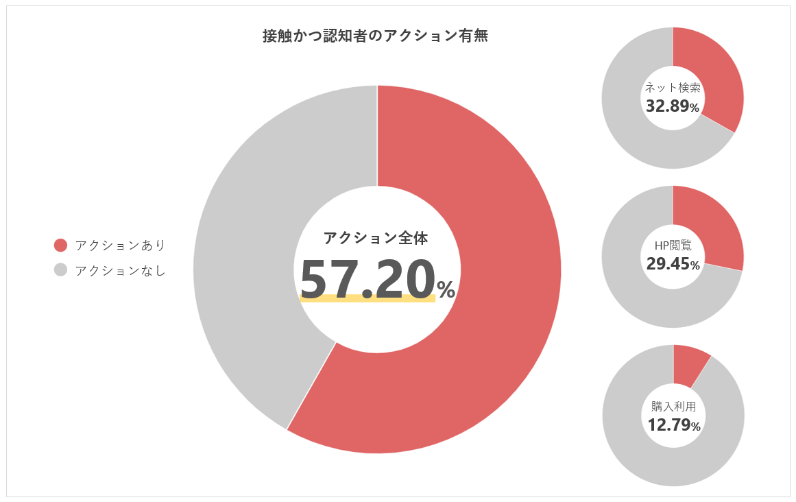 さらに、「ビデオリリース」を記憶していた視聴者のうち、平均して57.2%が、ネット検索、ホームページ閲覧、購入・利用などの具体的なアクションを起こしていることが明らかになりました。この結果は、「ビデオリリース」が消費者の能動的な行動を喚起する高い力を持っており、2人に1人の割合で行動を起こす可能性があることを示しています。