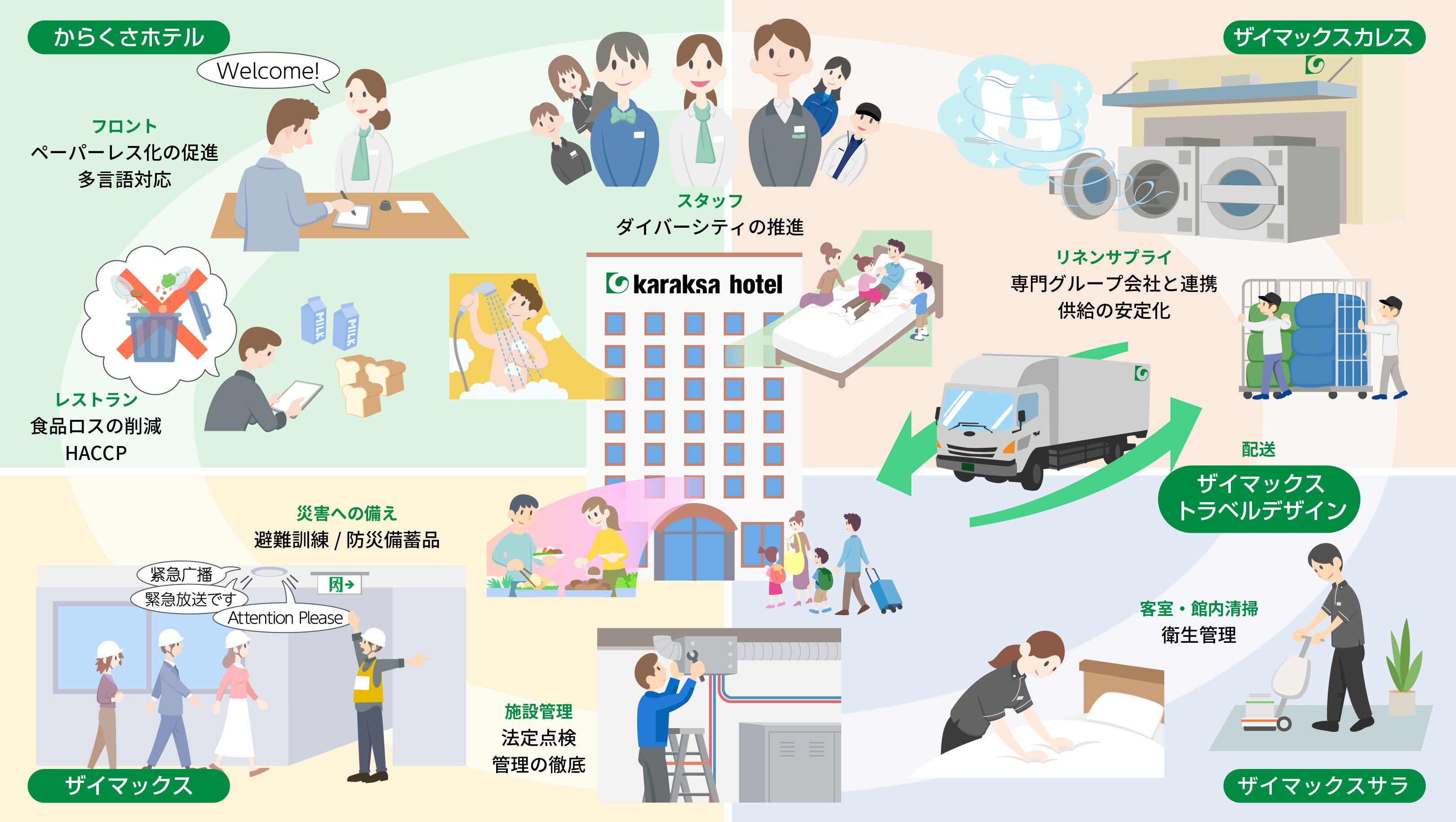 「安心・安全」「環境」「働きやすさ・働きがい」の分野別にからくさホテルズの日々の取り組みをご覧いただけるほか、親会社のザイマックスおよびグループ会社がサステナブルなホテル運営をどのように支えているのかも、イラストや事例、グループ会社のページを通じて紹介しています。