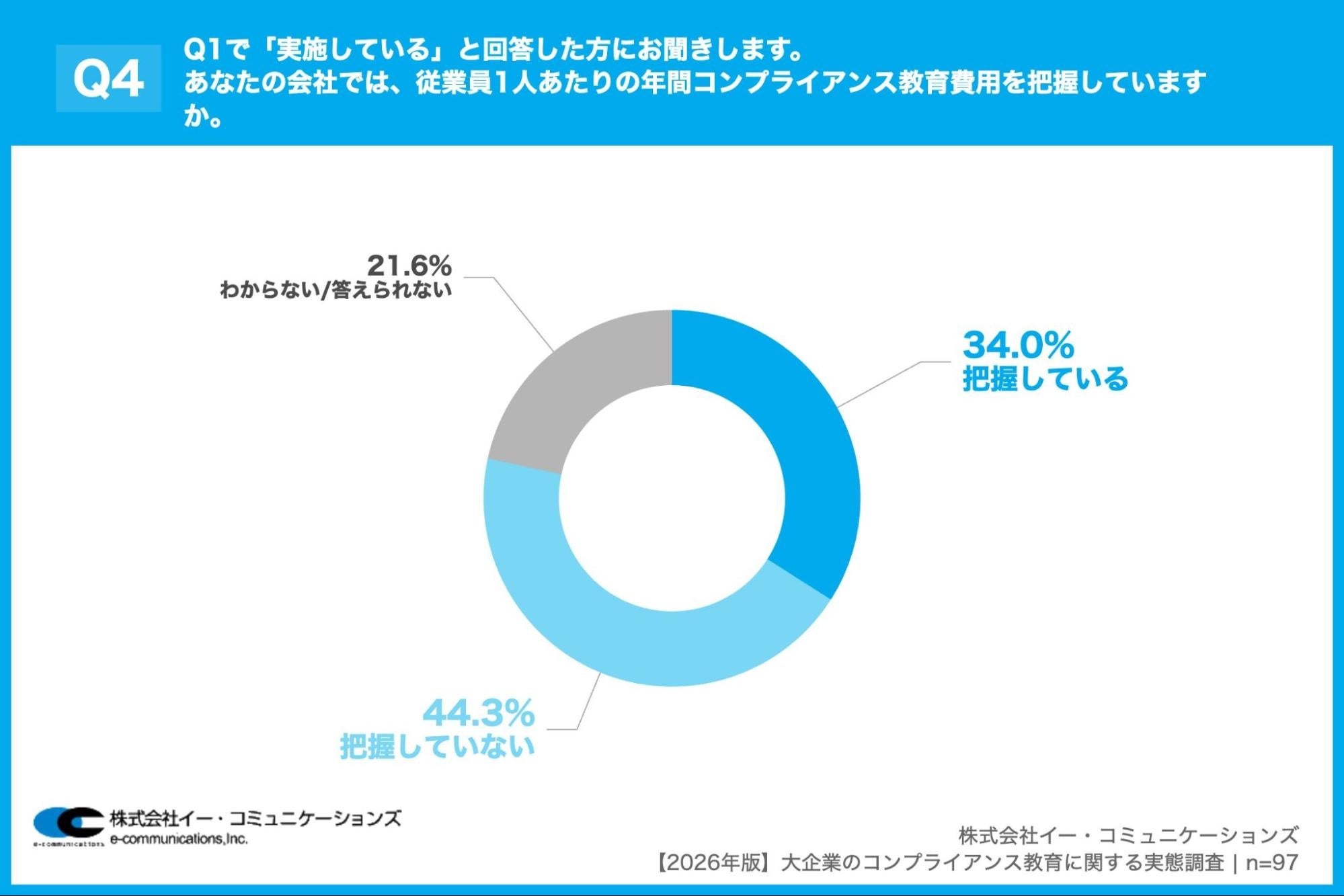 「Q4. Q1で「実施している」と回答した方にお聞きします。あなたの会社では、従業員1人あたりの年間コンプライアンス教育費用を把握していますか。」(n=97)と質問したところ、「把握している」が34.0%、「把握していない」が44.3%という回答となりました。