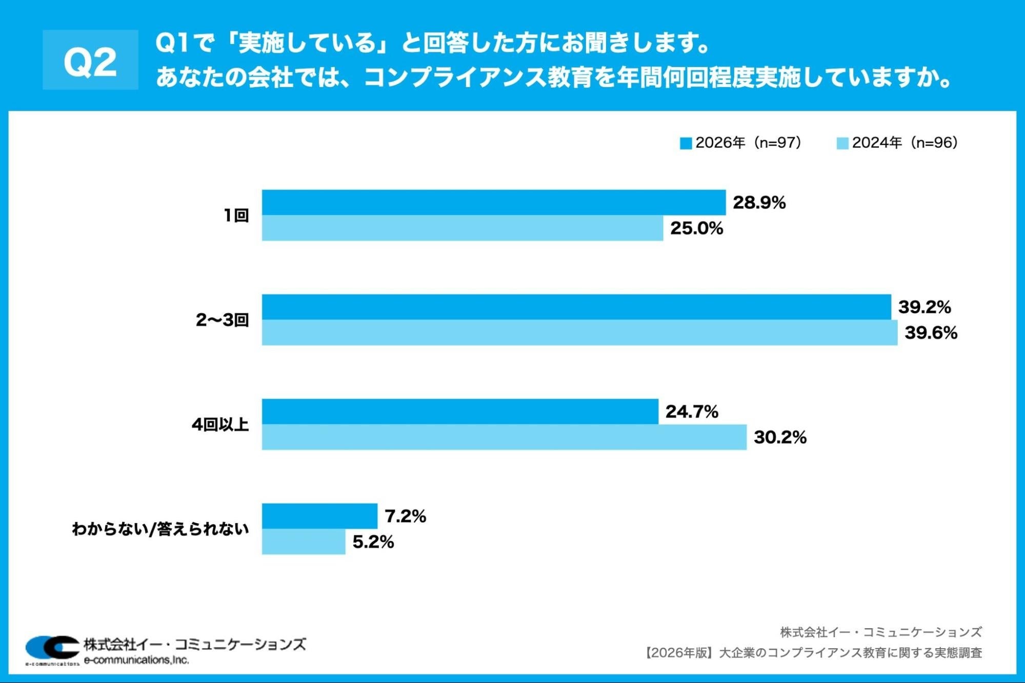 「Q2. Q1で「実施している」と回答した方にお聞きします。あなたの会社では、コンプライアンス教育を年間何回程度実施していますか。」(n=97)と質問したところ、「1回」が28.9%、「2~3回」が39.2%という回答となりました。