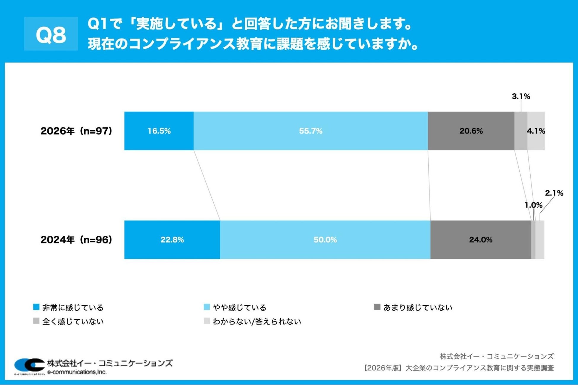 「Q8. Q1で「実施している」と回答した方にお聞きします。現在のコンプライアンス教育に課題を感じていますか。」(n=97)と質問したところ、「非常に感じている」が16.5%、「やや感じている」が55.7%という回答となりました。