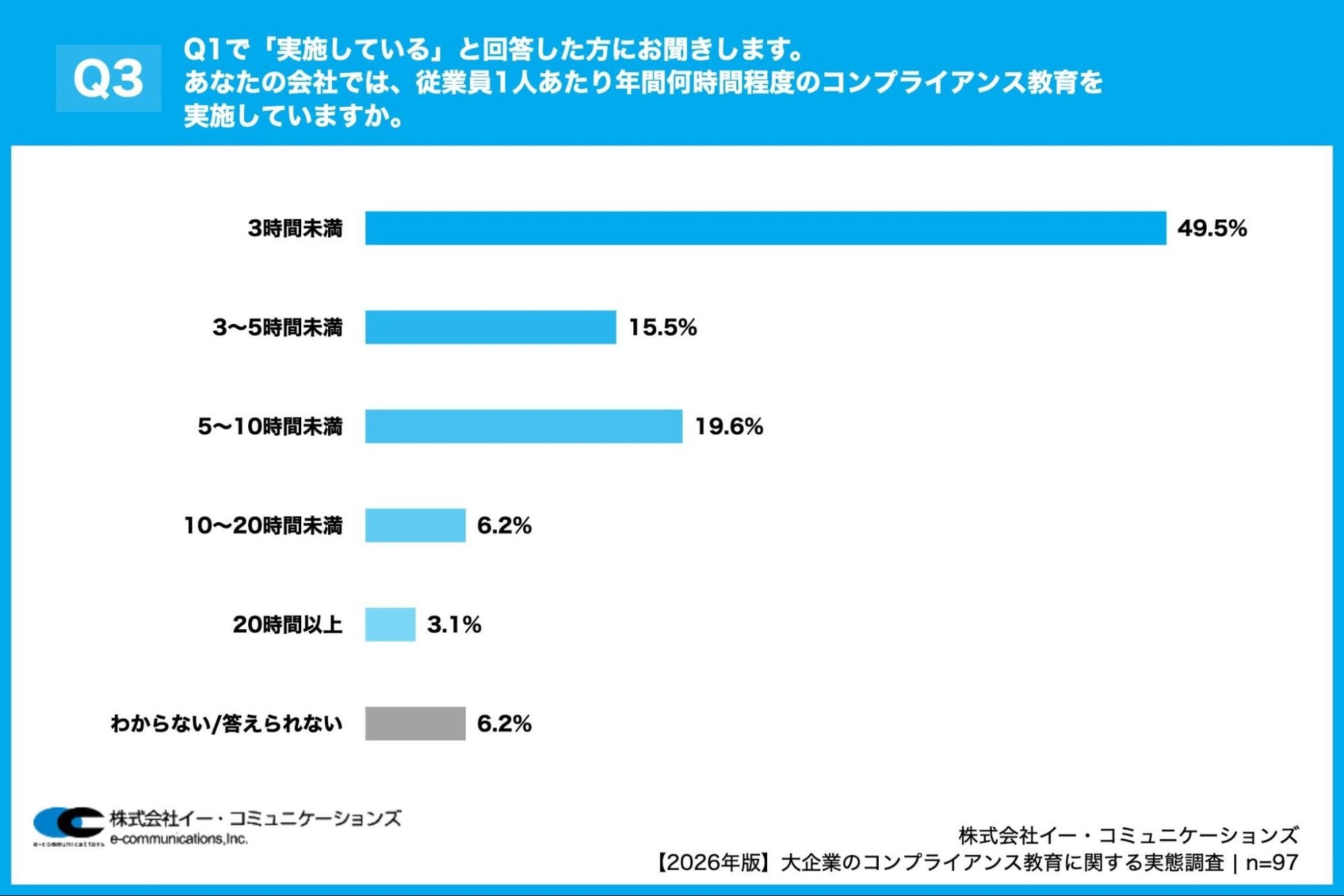 「Q3. Q1で「実施している」と回答した方にお聞きします。あなたの会社では、従業員1人あたり年間何時間程度のコンプライアンス教育を実施していますか。」(n=97)と質問したところ、「3時間未満」が49.5%、「3~5時間未満」が15.5%という回答となりました。