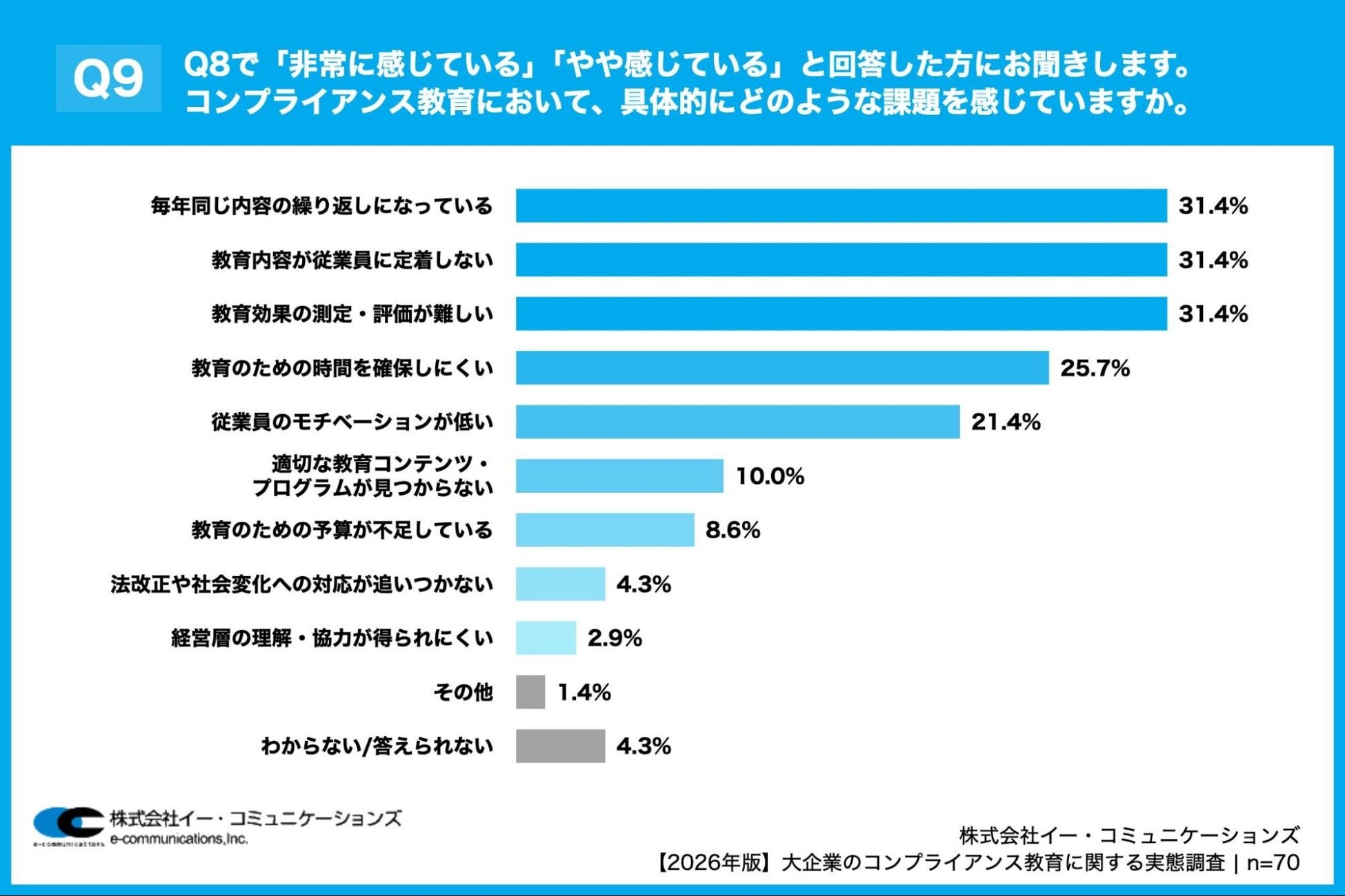 「Q9. Q8で「非常に感じている」「やや感じている」と回答した方にお聞きします。コンプライアンス教育において、具体的にどのような課題を感じていますか。(複数回答)」(n=70)と質問したところ、「毎年同じ内容の繰り返しになっている」が31.4%、「教育内容が従業員に定着しない」が31.4%、「教育効果の測定・評価が難しい」が31.4%という回答となりました。