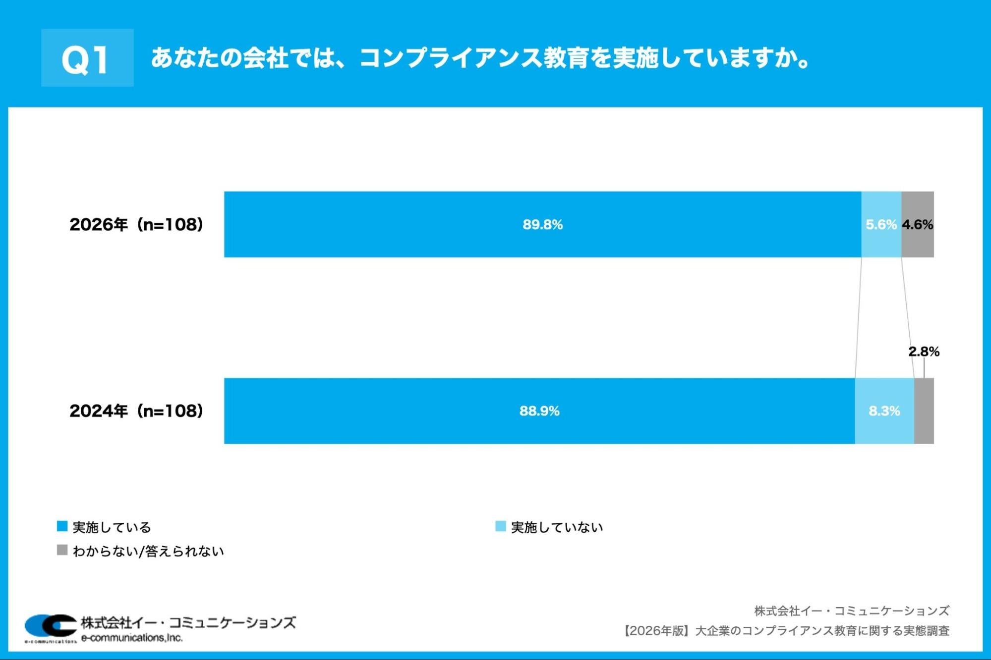 株式会社イー・コミュニケーションズ(本社:東京都港区、代表取締役:佐藤信也)は、大企業(従業員数1,000名以上)の経営者・役員108名を対象に、【2026年版】大企業のコンプライアンス教育に関する実態調査を実施しましたので、お知らせいたします。