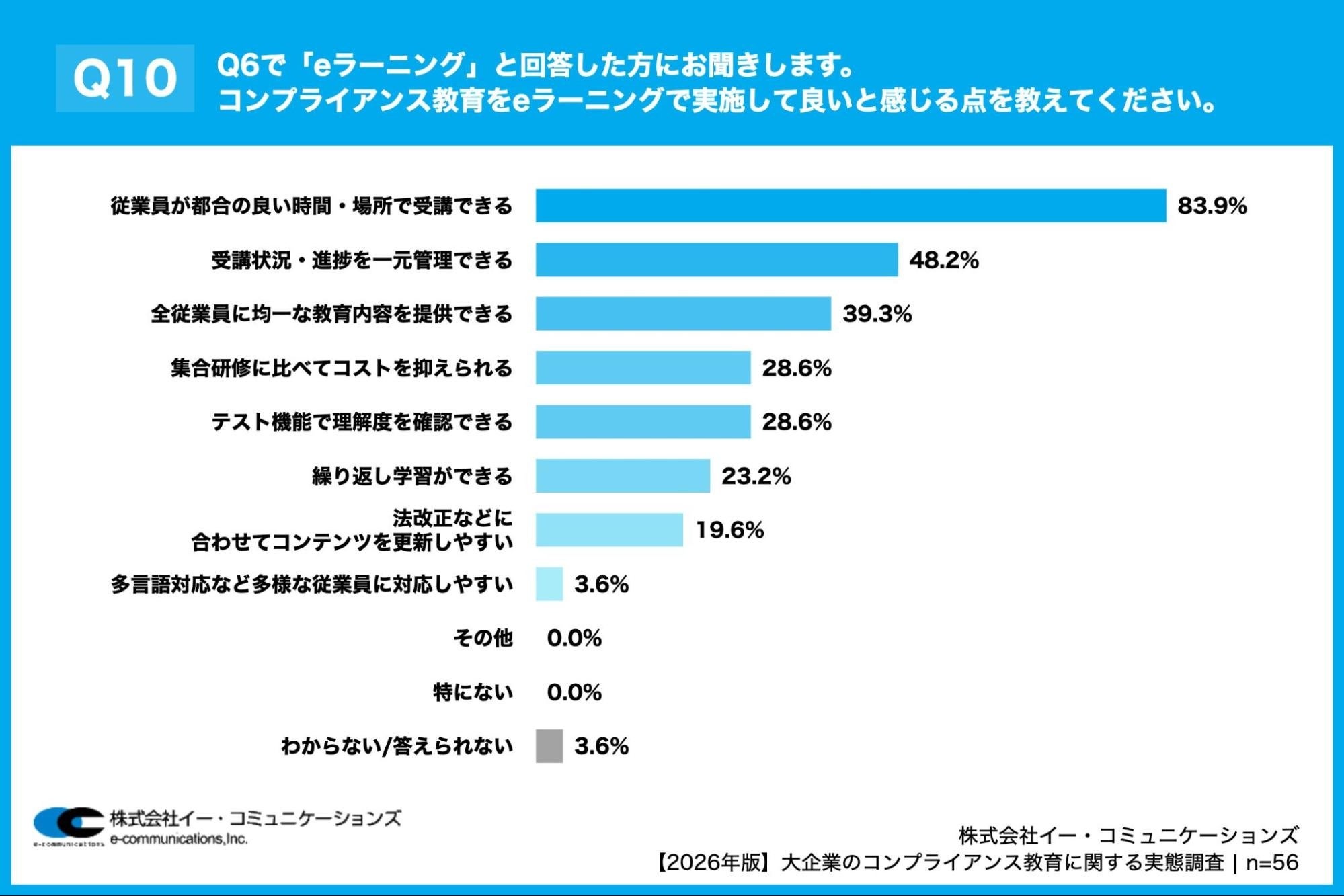 「Q10. Q6で「eラーニング」と回答した方にお聞きします。コンプライアンス教育をeラーニングで実施して良いと感じる点を教えてください。(複数回答)」(n=56)と質問したところ、「従業員が都合の良い時間・場所で受講できる」が83.9%、「受講状況・進捗を一元管理できる」が48.2%、「全従業員に均一な教育内容を提供できる」が39.3%という回答となりました。