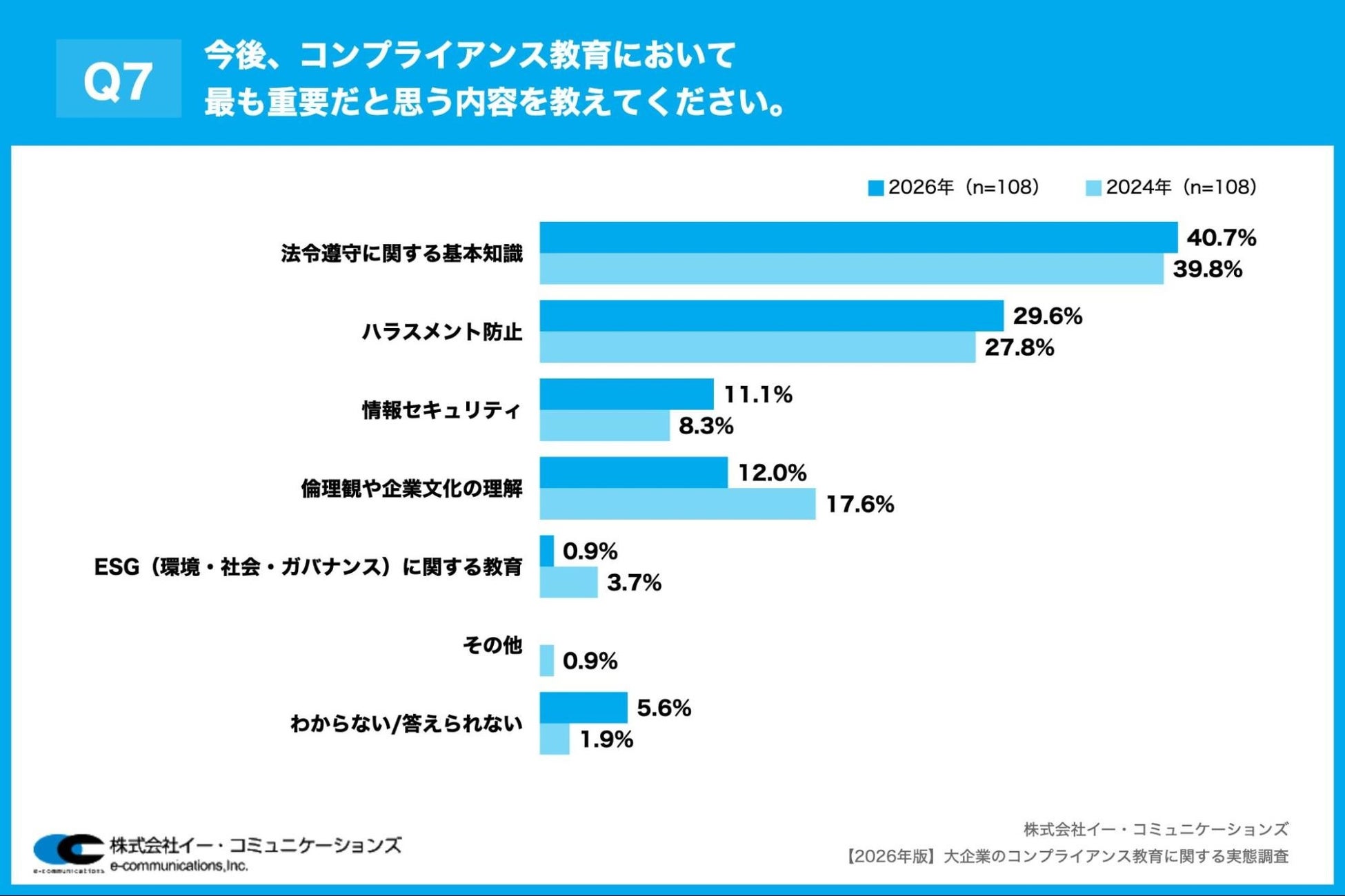 「Q7. 今後、コンプライアンス教育において最も重要だと思う内容を教えてください。」(n=108)と質問したところ、「法令遵守に関する基本知識」が40.7%、「ハラスメント防止」が29.6%という回答となりました。