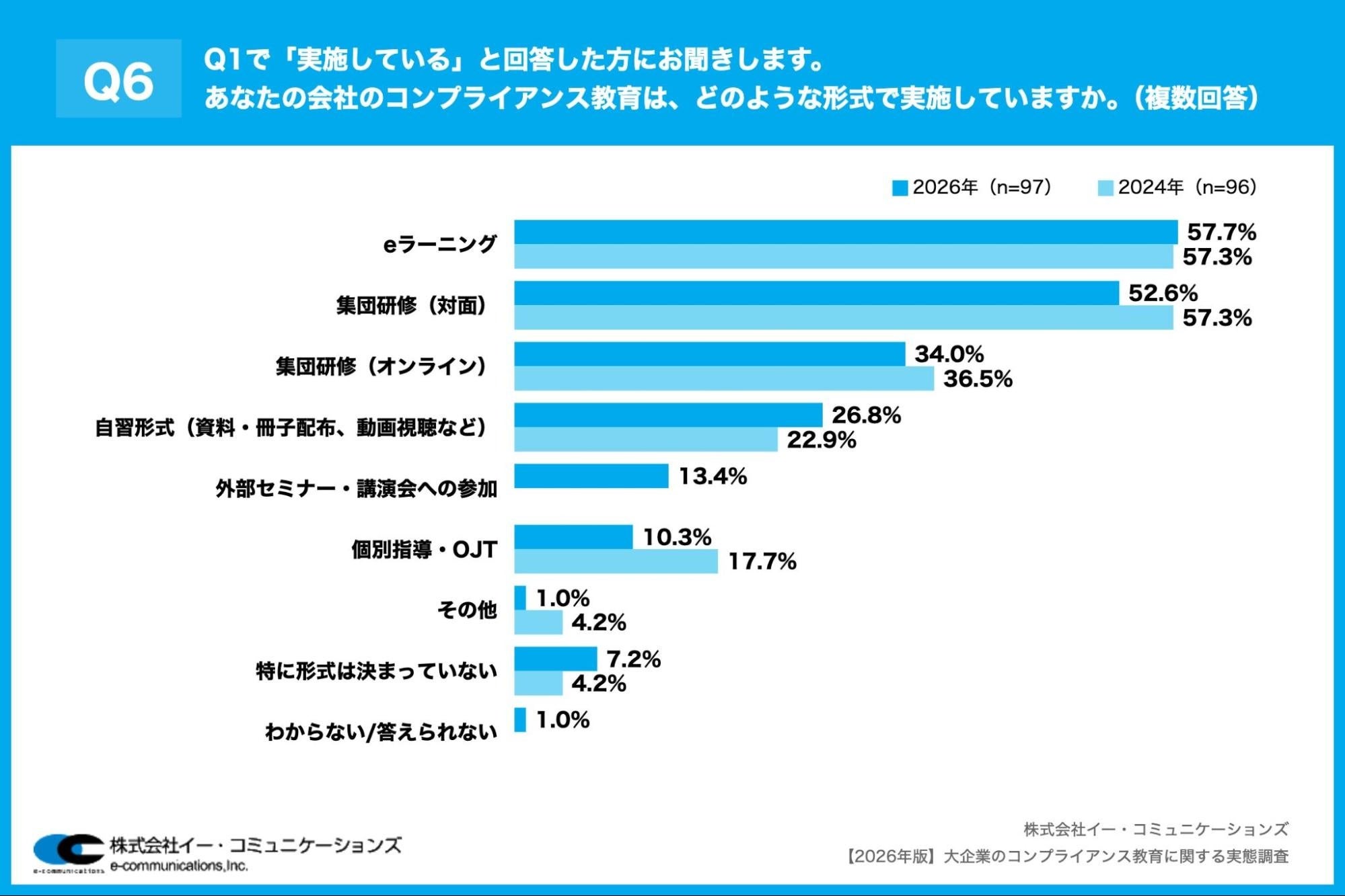 「Q6. Q1で「実施している」と回答した方にお聞きします。あなたの会社のコンプライアンス教育は、どのような形式で実施していますか。(複数回答)」(n=97)と質問したところ、「eラーニング」が57.7%、「集団研修(対面)」が52.6%、「集団研修(オンライン)」が34.0%という回答となりました。