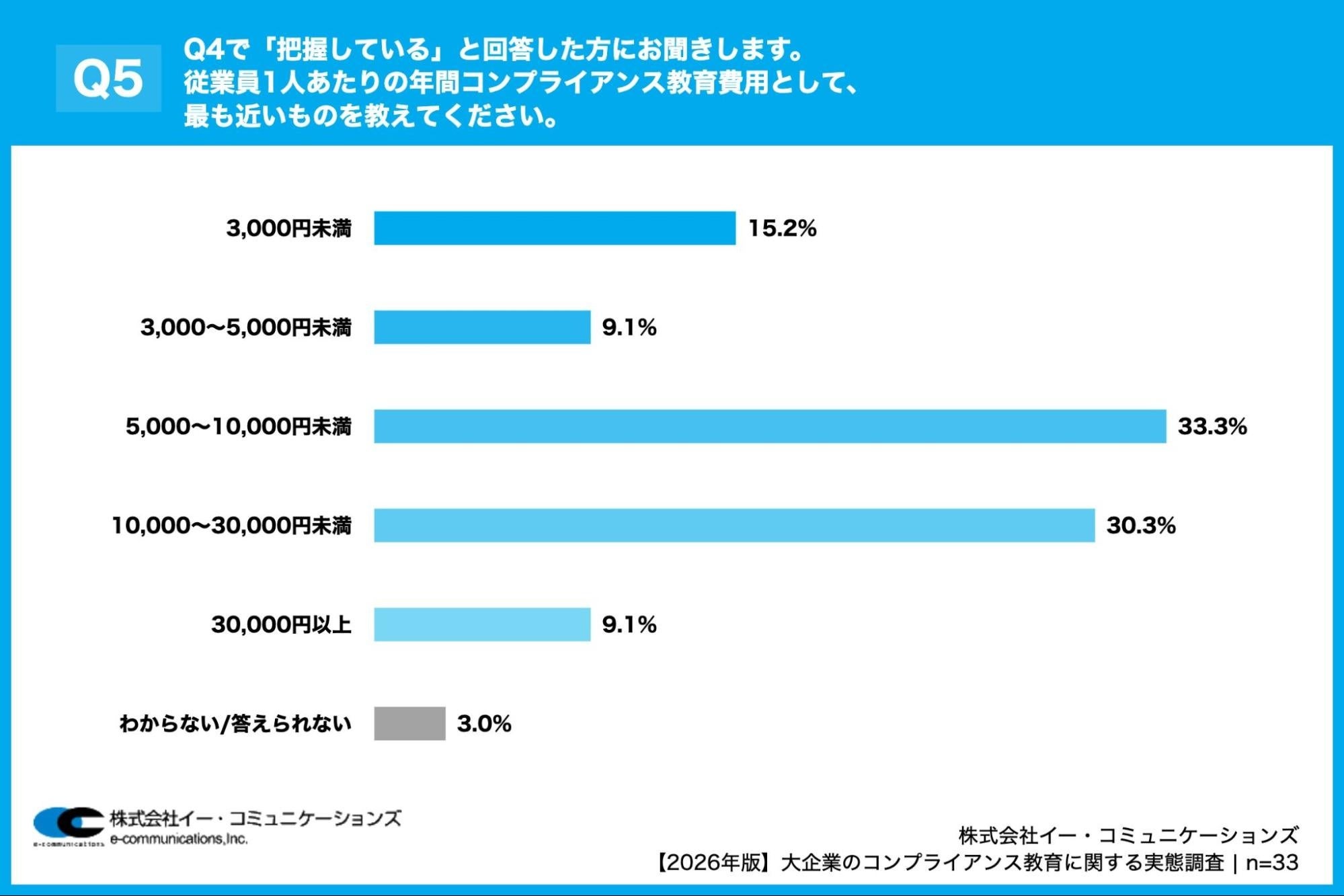 「Q5. Q4で「把握している」と回答した方にお聞きします。従業員1人あたりの年間コンプライアンス教育費用として、最も近いものを教えてください。」(n=33)と質問したところ、「5,000~10,000円未満」が33.3%、「10,000~30,000円未満」が30.3%という回答となりました。