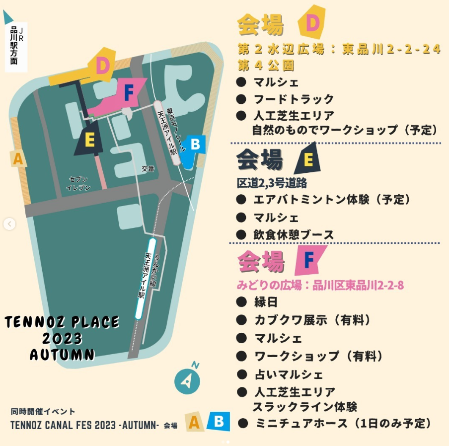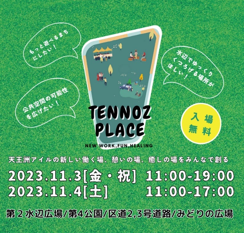 公園、公園空地、道路といった公共空間を「賑わいのある場所にしたい」そんな想いから始まったイベント。運営はエリアマネジメント会員含む地域の賛同者で行い、このイベントに賛同した天王洲エリア内のテナント・天王洲エリア近隣の住民の皆さんなども出店者として参加します。新しい働き場所、憩いの場、癒しの場をみんなで創ることを目的としています。