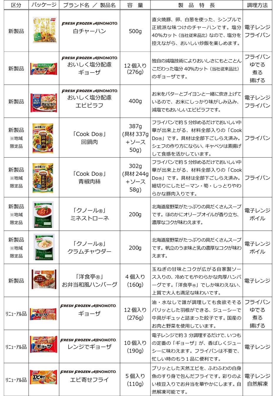 「おいしさ No.1」と「楽しさ」では、永久改良を続けている「ギョーザ」のリニューアルや、簡単に手作り料理を楽しめる「Cook Do®」シリーズ、電子レンジで贅沢なスープを楽しめる「クノール®」シリーズを発売します。また、「健康・栄養」では、減塩をテーマにした「白チャーハン」や「おいしく塩分配慮ギョーザ」、「おいしく塩分配慮エビピラフ」など、そして、「環境への配慮」では、紙を一部使用した袋パッケージに変更した「黒豚大餃子」と「海老大餃子」を発売します。 今後も、当社ならではの製品を展開しながら、食べる人、使う人の気持ちに寄り添った食スタイルを提案することで、生活者の皆さまに「感動」で「笑顔」をお届けしていきます。