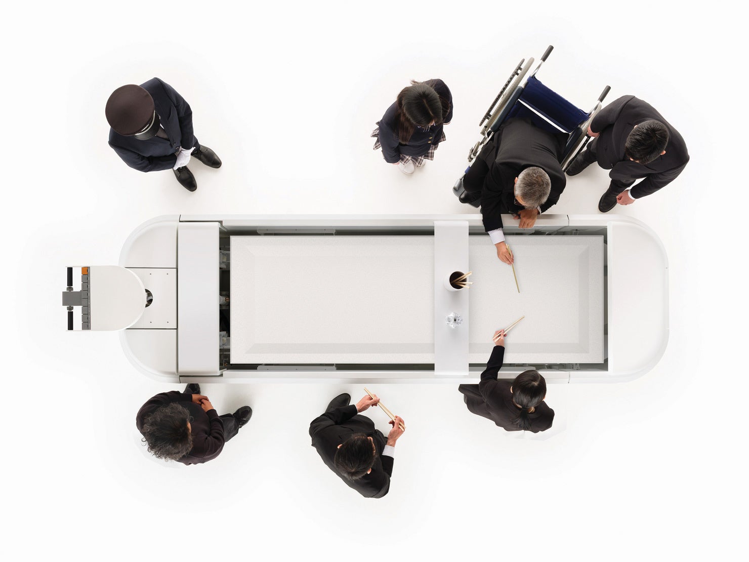 火葬場では通常、霊柩車から火葬炉前室まで棺を搬送する棺台車と、火葬終了後の遺骨を炉から収骨室(または収骨室前の祭壇)へと運ぶ収骨台車の2台が運用されていますが、火葬場内の保管スペースや充電機器、動線設計といった面に大きな影響を与えています。「フルムーン」は、この2台の台車を統合することにより、保管‧充電‧導線設計を集約し、省スペースで柔軟性の高い火葬場の実現を試みるものです。